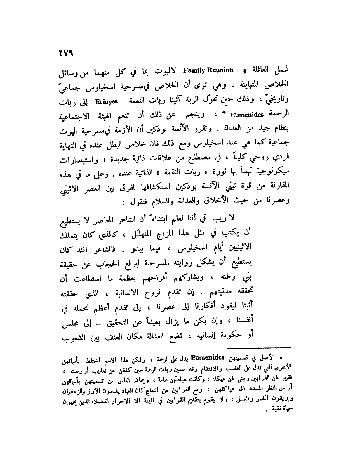 لا ريب في أننا نعلم ابتداءً أن الشاعر المعاصر لا يستطيع أن يكتب في مثل هذا المزاج المتهلل، كالذي كان يمتلك الاثينيين أيام اسخيلوس، فيما يبدو. فالشاعر آنئذ كان يستطيع أن يشكل روايته المسرحية ليرفع الحجاب عن حقيقة بنى وطنه، ويشاركهم أفراحهم بعظمة ما استطاعت أن تحققه مدينتهم. إن تقدم الروح الإنسانية، الذي حققته أثينا ليقود أفكارنا إلى عصرنا، إلى تقدم أعظم نحمله في أنفسنا، وإن يكن ما يزال بعيداً عن التحقيق؟ إلى مجلس أو حكومة إنسانية، تضع العدالة مكان العنف بين الشعوب
