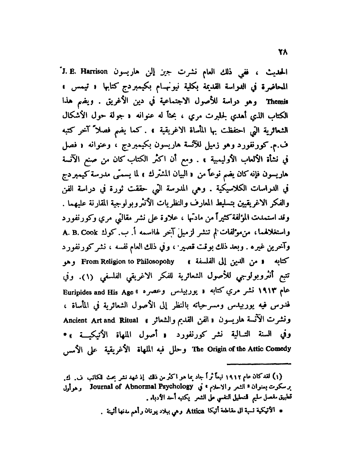 الحديث، ففي ذلك العام نشرت جين إلن هاريسون J. E. Harrison المحاضرة في الدراسة القديمة بكلية نيونهام بكيمبردج كتابها " تيمس " Themis وهو دراسة للأصول الاجتماعية في دين الإغريق. ويضم هذا الكتاب الذي أهدي لجبرت مري، بحثاً له عنوانه " جولة حول الأشكال الشعائرية التي احتفظت بها المأساة الإغريقية ". كما يضم فصلاً آخر كتبه ف. م. كورنفورد وهو زميل للآنسة هاريسون بكيمبردج، وعنوانه " فصل في نشأة الألعاب الأولمبية ". ومع أن اكثر الكتاب كان من صنع الآنسة هاريسون فإنه كان يضم نوعاً من " البيان المشترك " لما يسمى مدرسة كيمبردج في الدراسات الكلاسيكية. وهي المدرسة التي حققت ثورة في دراسة الفن والفكرالإغريقيين بتسليط المعارف والنظريات الأنثروبولوجية المقارنة عليهما. وقد استمدت المؤلفة كثيراً من مادتها، علاوة على نشر مقالتي مري وكور نفورد واستغلالهما، من مؤلفات لم تنشر لزميل آخر لها اسمه أ. ب. كوك A. B. cook وآخرين غيره. وبعد ذلك بوقت قصير، وفي ذلك العام نفسه، نشر كورنفورد كتابه " من الدين إلى الفلسفة " From Religion to Philosopohy وهو تتبع أنثروبولوجي للأصول الشعائرية للفكر الإغريقي الفلسفي (1) . وفي عام 1913 نشر مري كتابه " يوربيدس وعصره " Euripides and His Age فدرس فيه بيوربيدس ومسرحياته بالنظر إلى الأصول الشعائرية في المأساة، ونشرت الآنسة هاريسون " الفن القديم والشعائر " Ancient Art and Ritual وفي السنة التالية نشر كورنفورد " أصول الملهاة الأتيكية " (2) The Oriin of the Attic Comedy وحلل فيه الملهاة الإغريقية على الأسس