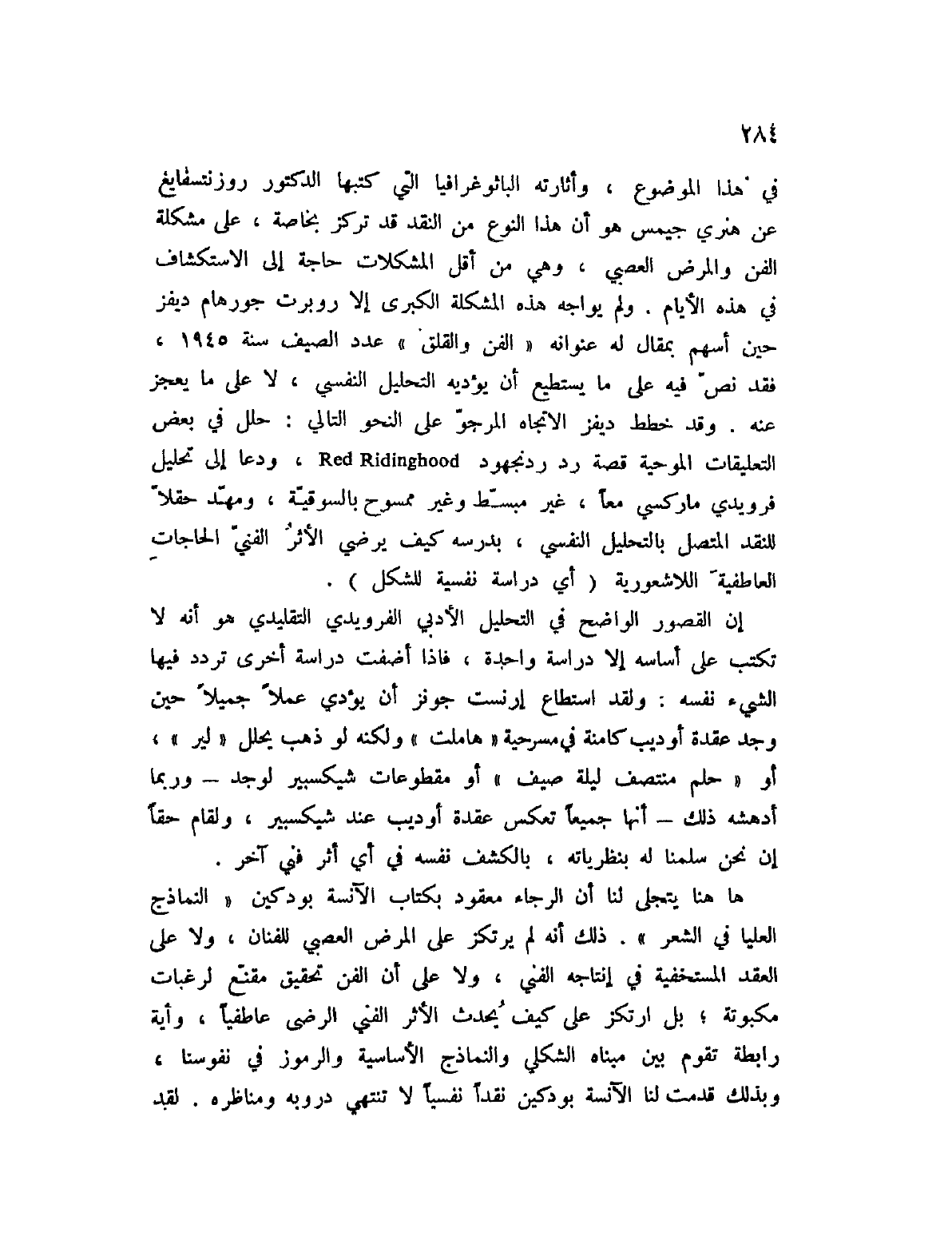 إن القصور الواضح في التحليل الأدبي الفرويدي التقليدي هو أنه لا تكتب على أساسه إلا دراسة واحدة، فإذا أضفت دراسة أخرى تردد فيها الشيء نفسه. ولقد استطاع إرنست جونز أن يؤدي عملاً جميلاً حين وجد عقدة أوديب كامنة في مسرحية " هاملت " ولكنه لو ذهب يحلل " لير "، أو " حلم منتصف ليلة صيف " أو مقطوعات شكسبير لوجد؟ وربما أدهشه ذلك؟ أنها جميعاً تعكس عقدة أوديب عند شكسبير، ولقام حقاً إن نحن سلمنا له بنظرياته، بالكشف نفسه في أي أثر فني آخر.