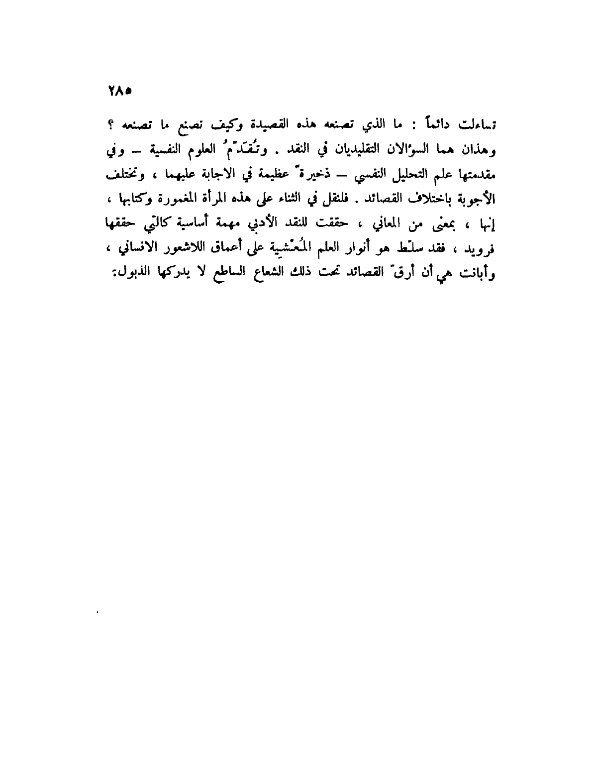 تساءلت دائماً: ما الذي تصنعه هذه القصيدة وكيف تصنع ما تصنعه؟ وهذان هما السؤالان التقليديان في النقد. وتقدم العلوم النفسية؟ وفي مقدمتها علم التحليل النفسي؟ ذخيرة عظيمة في الإجابة عليهما، وتختلف الأجوبة باختلاف القصائد. فلنقل في الثناء على هذه المرأة المغمورة وكتابها، إنها بمعنى من المعاني، حققت للنقد الأدبي مهمة أساسية كالتي حققها فرويد، فقد سلط هو أنوار العلم المعشية على أعماق اللاشعور الإنساني، وأبانت هي أن أرق القصائد تحت ذلك الشعاع الساطع لا يدركها الذبول.