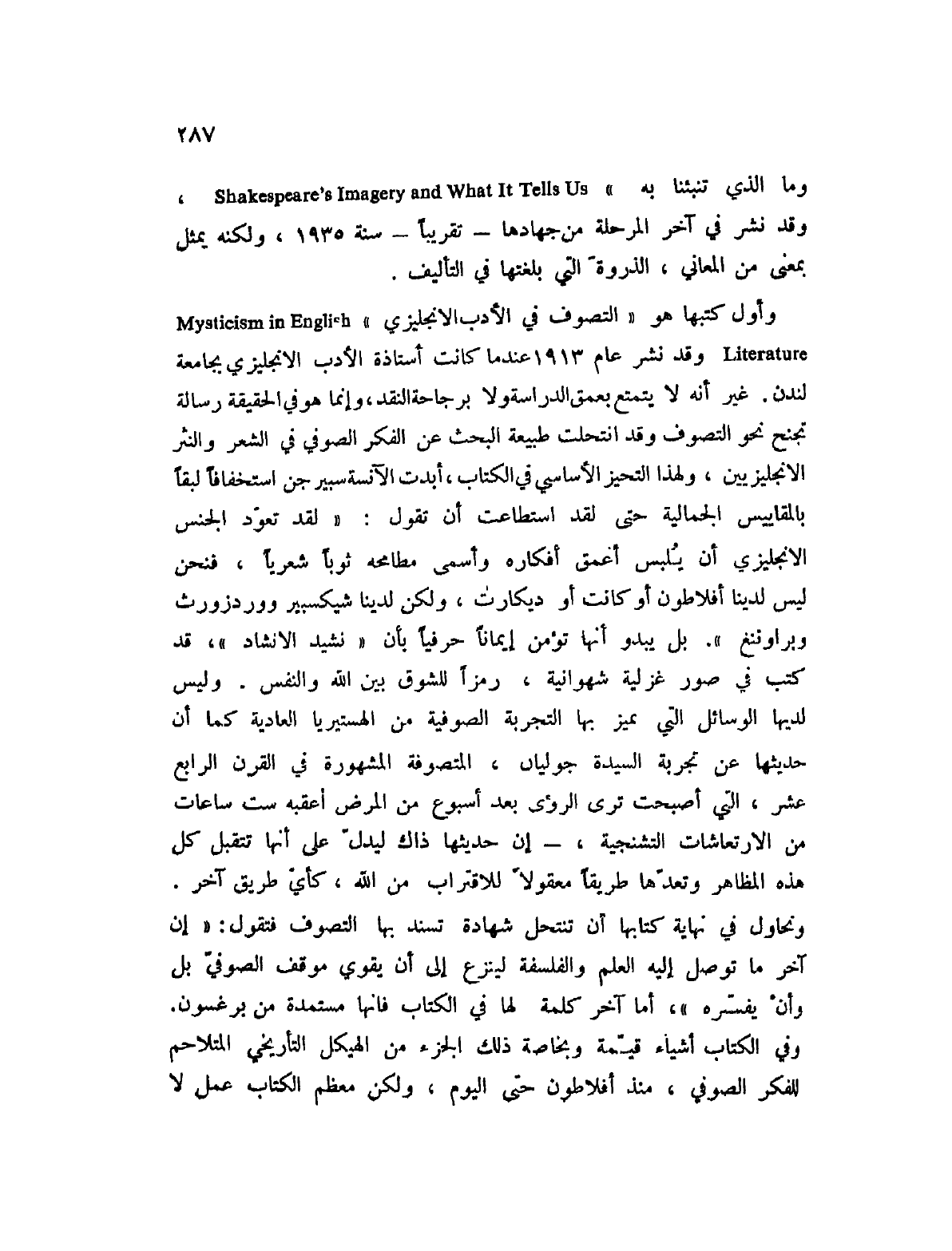 وما الذي تنبئنا به " Shakespeare " s Imagery and What It Tells Us وقد نشر في آخر المرحلة من جهادها؟ تقريباً؟ سنة 1935، ولكنه يمثل بمعنى من المعاني، الذروة التي بلغتها في التأليف.