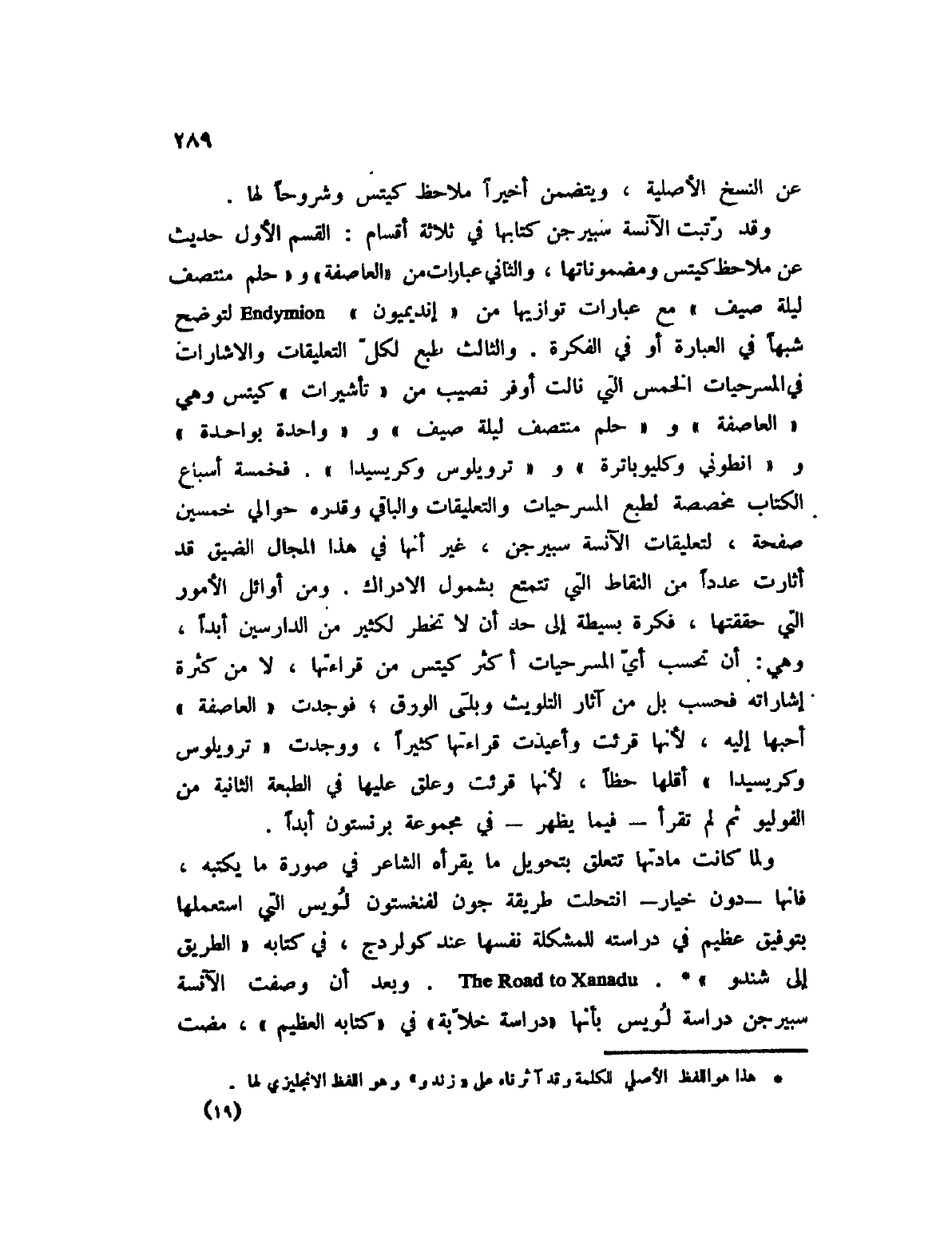 ولما كانت مادتها تعلق بتحويل ما يقرأه الشاعر في صورة ما يكتبه، فإنها؟ دون خيار؟ انتحلت طريقة جون لفنغستون لويس التي استعملها بتوفيق عظيم في دراسته للمشكلة نفسها عند كولردج، في كتابه " الطريق إلى شندو " (1) The Road to xanadu. وبعد أن وصفت الآنسة سبيرجن دراس لويس بأنها " دراسة خلابة " في كتابه العظيم "، مضت