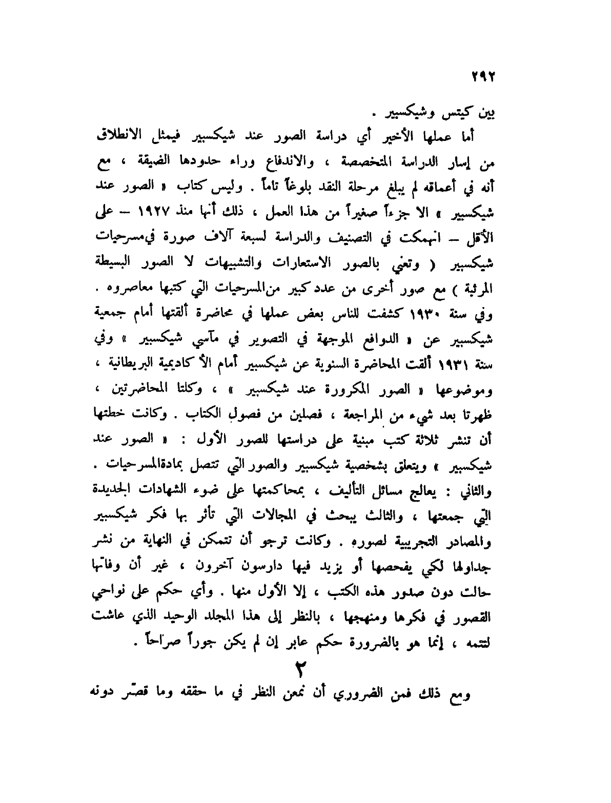 أما عملها الأخير أي دراسة الصور عند شكسبير فيمثل الانطلاق من إسار الدراسة المتخصصة، والاندفاع وراء حدودها الضيقة، مع أنه أعماقه لم يبلغ مرحلة النقد بلوغاً تاماً. وليس كتاب " الصور عند شكسبير " إلا جزءاً صغيراً من هذا العمل، ذلك أنها منذ 1927؟ على الأقل؟ انهمكت في التصنيف والدراسة لسبعة آلاف صورة في مسرحيات شكسبير (وتعني بالصور الاستعارات والتشبيهات لا الصور البسيطة المرئية) مع صور أخرى من عدد كبير من المسرحيات التي كتبها معاصروه. وفي سنة 1930 كشفت للناس بعض عملها في محاضرة ألقتها أمام جمعية شكسبير عن " الدوافع الموجهة في التصوير في مآسي شكسبير " وفي سنة 1931 ألقت المحاضرة السنوية عن شكسبير أمام الأكاديمية البريطانية، وموضوعها " الصور المكرورة عند شكسبير "، وكلتا المحاضرتين، ظهرتا بعد شيء من المراجعة، فصلين من فصول الكتاب. وكانت خطتها أن تنشر ثلاثة كتب مبنية على دراستها للصور الأول: " الصور عند شكسبير " ويتعلق بشخصية شكسبير والصور التي تتصل بمادة المسرحيات. والثاني: يعالج مسائل التأليف، بمحاكمتها على ضوء الشهادات الجديدة التي جمعتها، والثالث يبحث في المجالات التي تأثر بها فكر شكسبير والمصادر التجريبية لصوره. وكانت ترجو أن تتمكن في النهاية من نشر جداولها لكي يفحصها أو يزيد فيها دارسون آخرون، غير أن وفاتها حالت دون صدور هذه الكتب، إلا الأول منها. وأي حكم على نواحي القصور في فكرها ومنهجها، بالنظر إلى هذا المجلد الوحيد الذي عاشت لتتمه، إنما هو بالضرورة حكم عابر إن لم يكن جوراً صراحاً.