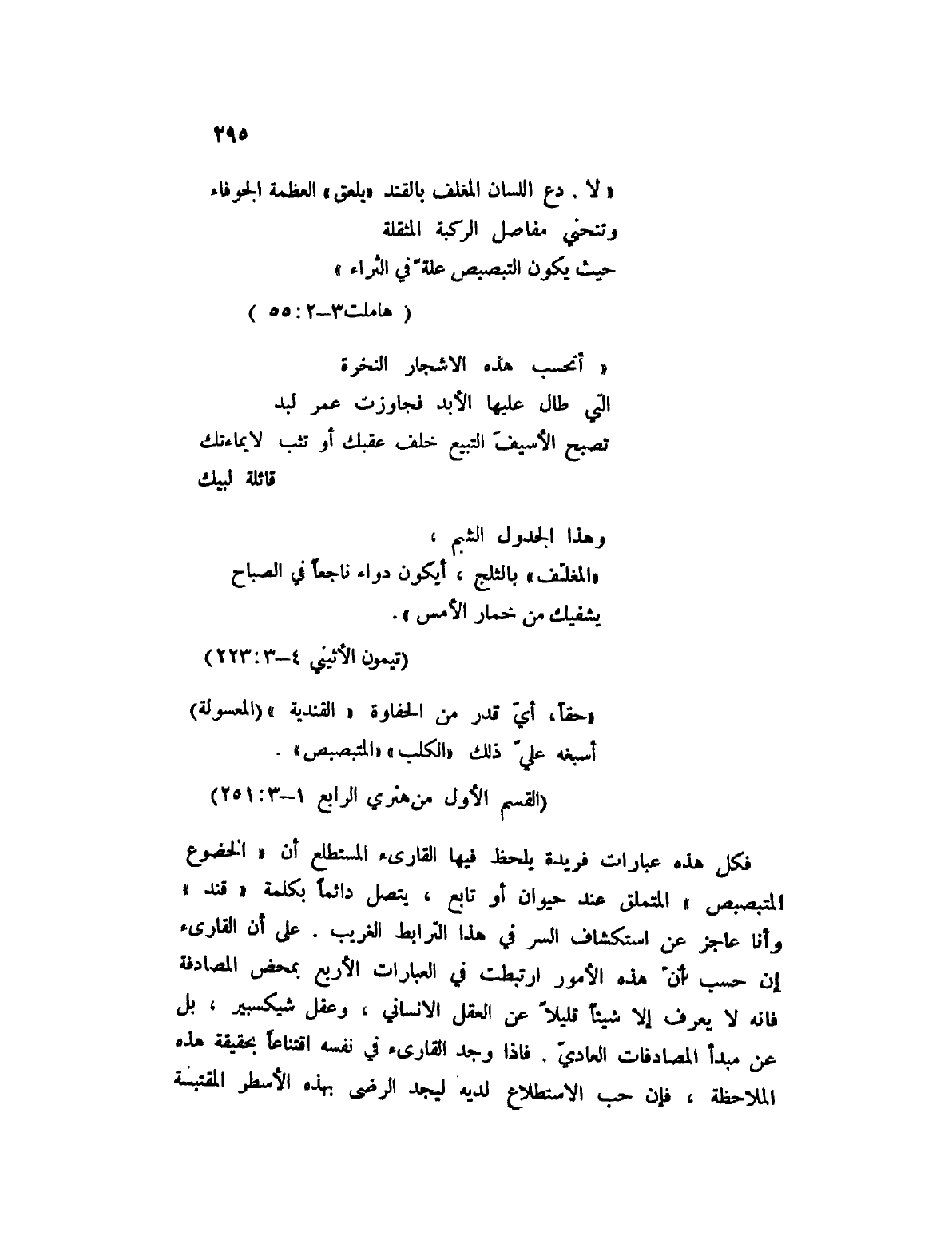 فكل هذه عبارات فريدة يلحظ فيها القارئ المستطلع أن " الخضوع المتبصبص " المتملق عند حيوان أو تابع، يتصل دائماً بكلمة " قند " وأنا عاجز عن استكشاف السر في هذا الترابط الغريب. على أن القارئ إن حسب أن هذه الأمور ارتبطت في العبارات الأربع بمحض المصادفة فإنه لا يعرف إلا شيئاً قليلاً عن العقل الإنساني، وعقل شكسبير، بل عن مبدأ المصادفات العادي. فإذا وجد القارئ في نفسه اقتناعاً بحقيقة هذه الملاحظة، فإن حب الاستطلاع لديه ليجد الرضى بهذه الأسطر المقتبسة
