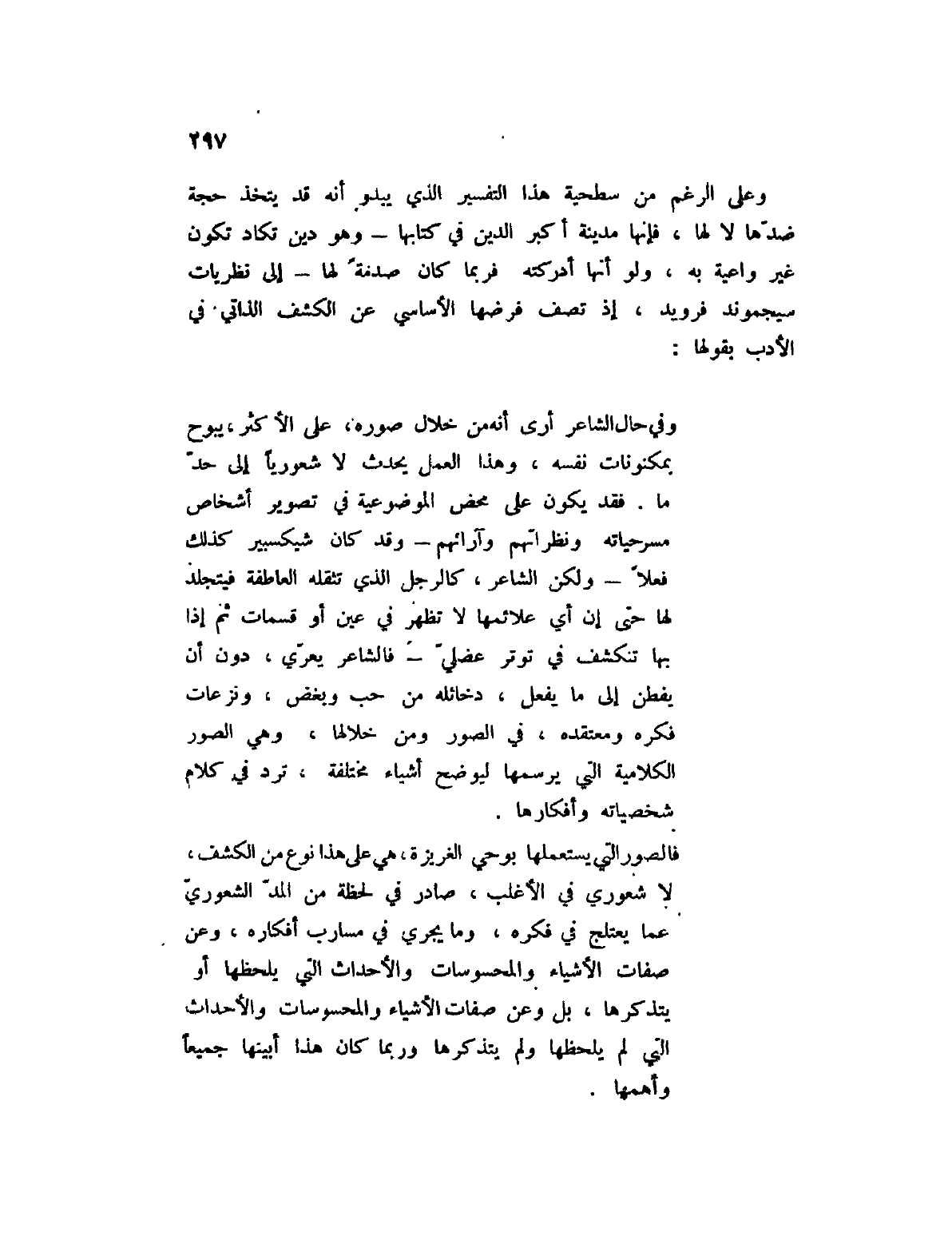 فالصور التي يستعملها بوحي الغزيرة، هي على هذا نوع من الكشف، لا شعوري في الأغلب، صادر في لحظة من المد الشعوري عما يعتلج في فكره، وما يجري في مسارب أفكاره، وعن صفات الأشياء والمحسوسات والأحداث التي لم يلحظها أو يتذكرها وربما كان هذا أبينها جميعاً وأهمها.
