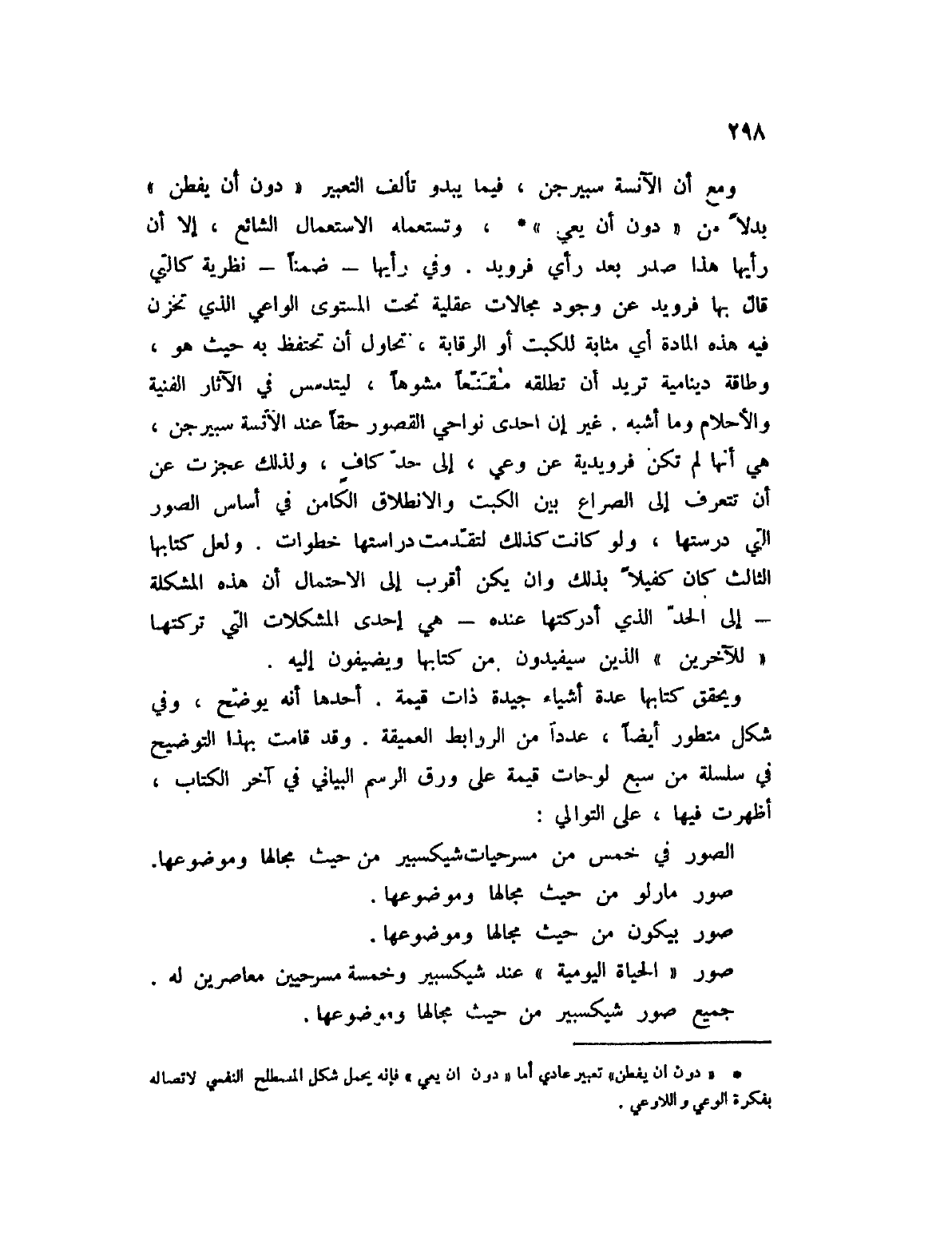 ومع أن الآنسة سبيرجن، فيما يبدو تألف التعبير " دون أن يفطن " بدلاً من " دون أن يعي " (1) ، وتستعمله الاستعمال الشائع، إلا أن رأيها هذا صدر بعد رأي فرويد. وفي رأيها؟ ضمناً؟ نظرية كالتي قال بها فرويد عن وجود مجالات عقلية تحت المستوى الواعي الذي تخزن فيه هذه المادة أي مثابة للكبت أو الرقابة، تحاول أن تحتفظ به حيث هو، وطاقة دينامية تريد أن تطلقه مقنعاً مشوهاً، ليتدمس في الآثار الفنية والأحلام وما أشبه. غير إن إحدى نواحي القصور حقاً عند الآنسة سيبرجن، هي أنها لم تكن فرويدية عن وعي، إلى حد كافٍ، ولذلك عجزت عن أن تتعرف إلى الصراعه بين الكبت والانطلاق الكامن في أساس الصور التي درستها، ولو كانت كذلك لتقدمت دراستها خطوات. ولعل كتابها الثالث كان كفيلاً بذلك وإن يكن أقرب إلى الاحتمال أن هذه المشكلة؟ إلى الحد الذي أدركته عنده؟ هي إحدى المشكلات التي تركتها " للآخرين " الذين سيفيدون من كتابها ويضيفون إليه.