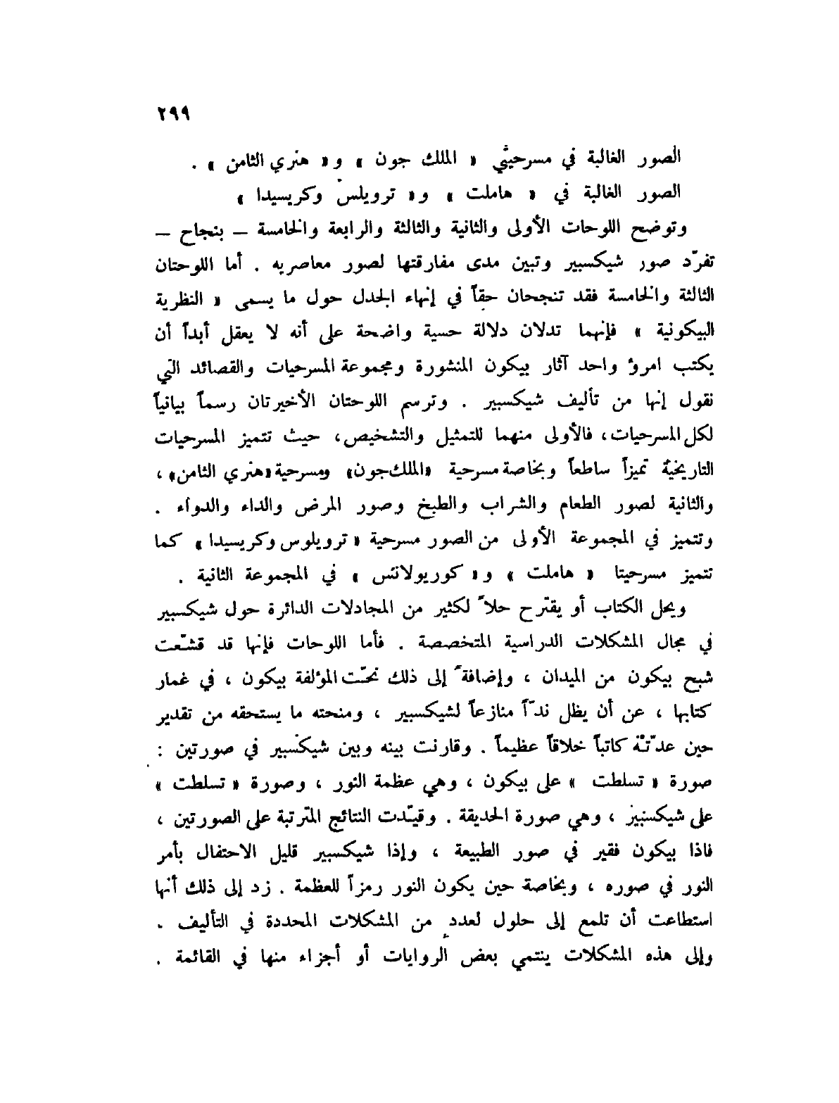 ويحل الكتاب أو يقترح حلاً لكثير من المجادلات الدائرة حول شكسبير في مجال المشكلات الدراسية المتخصصة. فأما اللوحات فإنها قد قشعت شبح بيكون من الميدان، وإضافة إلى ذلك نحت المؤلفة بيكون، في غمار كتابها، عن أن يظل نداً منازعاً لشكسبير، ومنحته ما يستحقه من تقدير حين عدته كاتباً خلافاً عظيماً. وقارنت بينه وبين شكسبير في صورتين: صورة " تسلطت " على بيكون، وهي عظمة النور، وصور " تسلطت " على شكسبير، وهي صورة الطبيعة، وإذا شكسبير قليل الاحتفال بأمر النور في صوره، وبخاصة حين يكون النور رمزاً للعظمة، زد إلى ذلك أنها استطاعت أن تلمع إلى حلول لعددٍ من المشكلات المحددة في التأليف، وإلى هذه المشكلات ينتمي بعض الروايات أو أجزاء منها في القائمة.