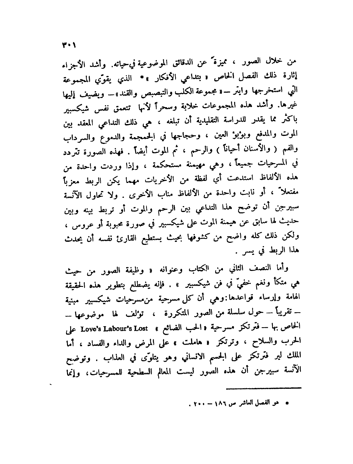 من خلال الصور، مميزة عن الدقائق الموضوعية في حياته. وأشد الأجزاء إثارة ذلك الفصل الخاص " بتداعي الأفكار " (1) الذي يقوي المجموعة التي استخرجها وايتر؟ " مجموعة الكلب والتبصبص والقند "؟ ويضيف إليها غيرها. واشد هذه المجموعات خلابة وسحراً لأنها تتعمق نفس شكسبير بأكثر مما يقدر للدراسة التقليدية أن تبلغه، هي ذلك التداعي المعقد بين الموت والمدفع وبؤبؤ العين، وحجاجها في الجمجمة والدموع والسرداب والفم (والأسنان أحياناً) والرحم، ثم الموت أيضاً. فهذه الصورة تتردد في المسرحيات جميعاً، وهي مهيمنة مستحكمة، وإذا وردت واحدة من هذه الألفاظ استدعت أي لفظة من الأخريات مهما يكن الربط معزباً مفتعلاً، أو نابت واحدة من الألفاظ مناب الأخرى. ولا تحاول الآنسة سبيرجن أن توضح هذا التداعي بين الرحم والموت أو تربط بينه وبين حديث لها سابق عن هيمنة الموت على شكسبير في صورة محبوبة أو عروس، ولكن ذلك كله واضح من كشوفها بحيث يستطيع القارئ نفسه أن يحدث هذا الربط في يسر.