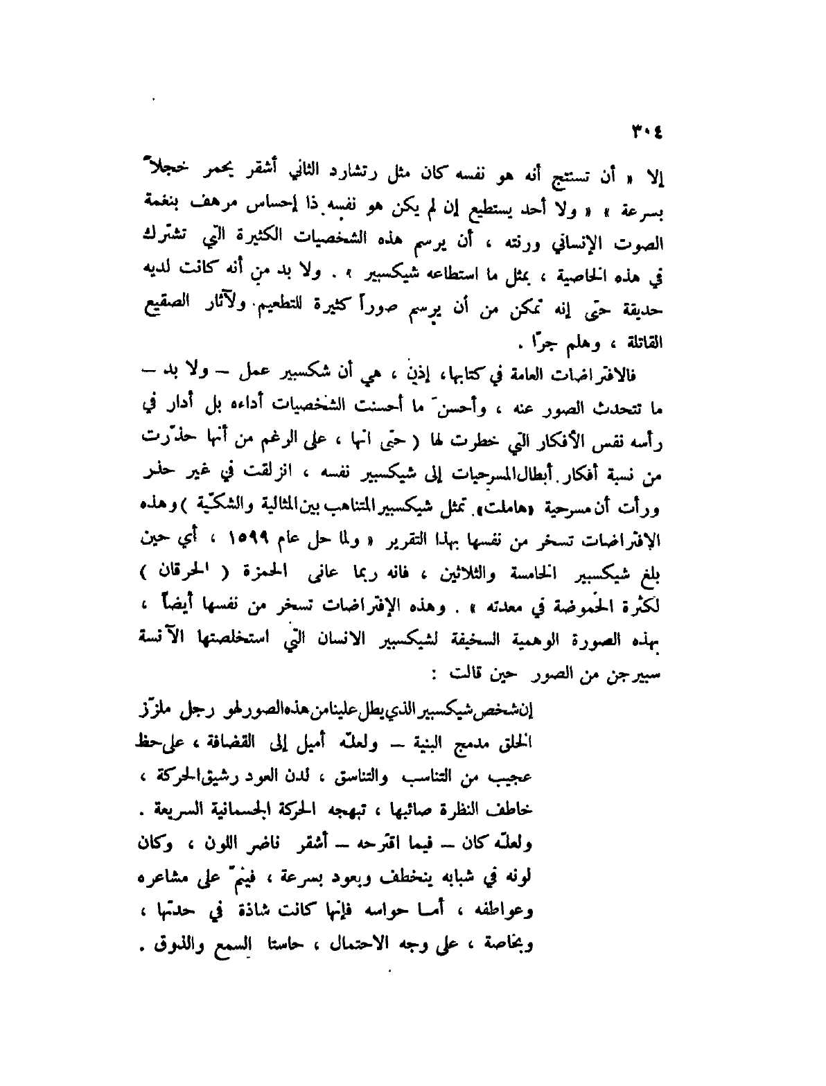 فالافتراضات العامة في كتابها، إذن، هي أن شكسبير عمل؟ ولابد؟ ما تتحدث الصور عنه، وأحسن ما أحسنت الشخصيات أداءه بل أدار في رأسه نفس الأفكار التي خطرت لها (حتى إنها، على الرغم من أنها حذرت من نسبة أفكار أبطال المسرحيات إلى شكسبير نفسه، انزلقت في غير حذر ورأت أن مسرحية " هاملت " تمثل شكسبير المتناهب بين المثالية والشكية) وهذه الافتراضات تسخر من نفسها بهذا التقرير " ولما حل عام 1599، أي حين بلغ شكسبير الخامسة والثلاثين، فإنه ربما عانى الحمزة (الحرقان) لكثرة الحموضة في معدته ". وهذه الافتراضات تسخر من نفسها أيضاً، بهذه الصورة الوهمية السخيفة لشكسبير الإنسان التي استخلصتها الآنسة سبيرجن من الصور حين قالت:
