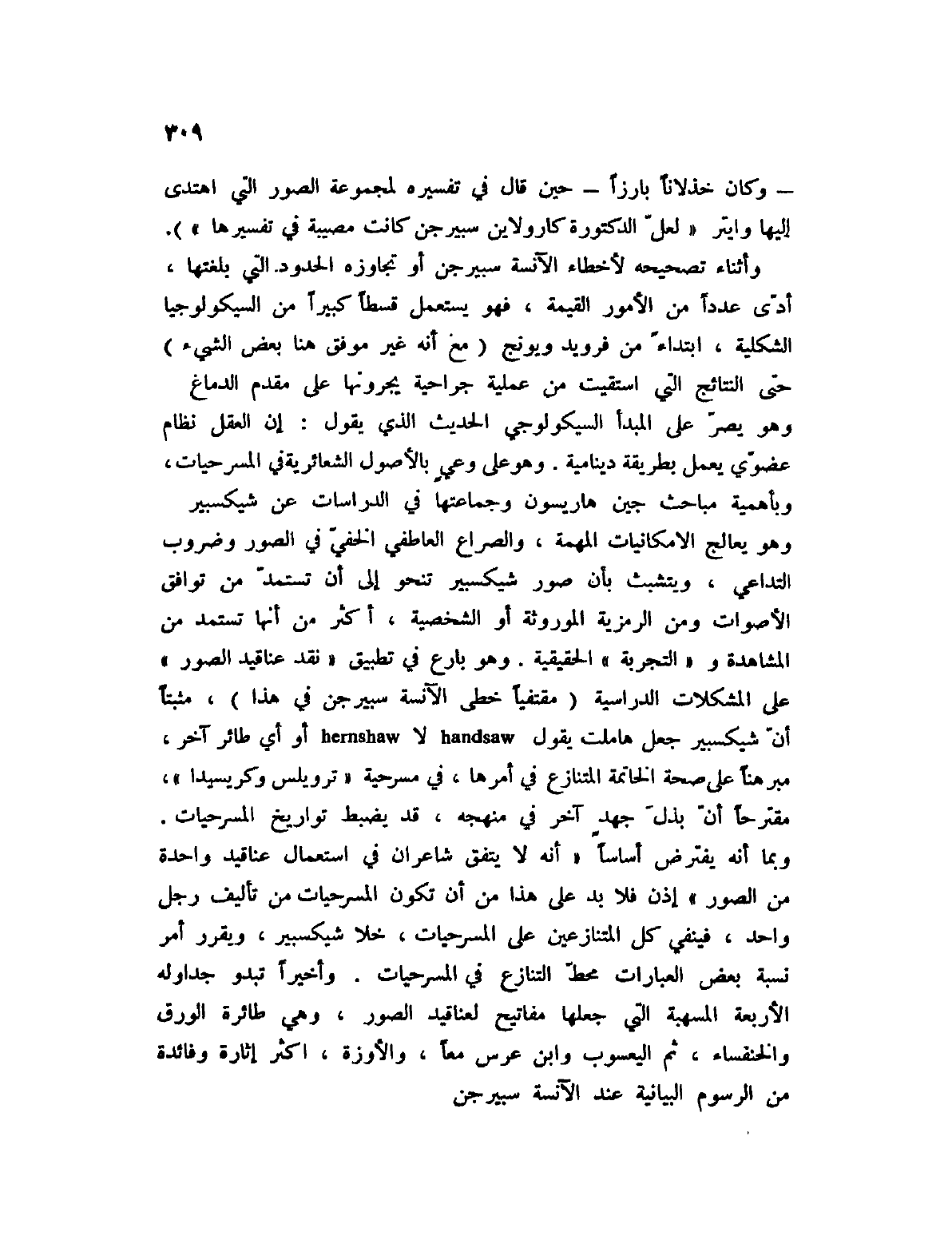 وأثناء تصحيحه لأخطاء الآنسة سيبرجن أو تجاوزه الحدود التي بلغتها، أدى عددا من الأمور القيمة، فهو يستعمل قسطا كبيرا من السيكولوجيا الشكلية، ابتداء من فرويد ويونج (مع أنه غير موفق هنا بعض الشيء) حتى النتائج التي استقيت من عملية جراحية يجرونها على مقدم الدماغ. وهو يصر على المبدأ السيكولوجي الحديث الذي يقول: إن العقل نظام عضوي يعمل بطريقة دينامية. وهو على وعي بالأصول الشعائرية في المسرحيات، وبأهمية مباحث جين هاريسون وجماعتها في الدراسات عن شيكسبير.