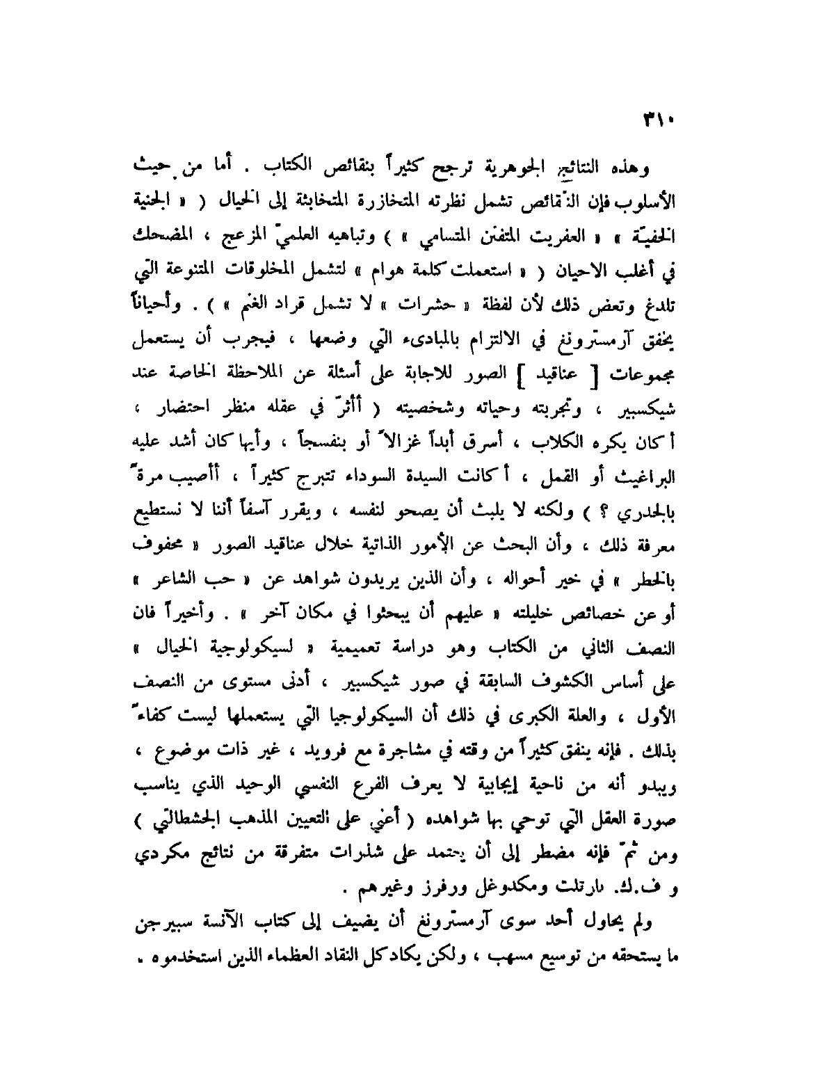 وهذه النتائج الجوهرية ترجح كثيرا بنقائص الكتاب. أما من حيث الأسلوب فإن النقائص تشمل نظرته المتخازرة المتخابثة إلى الخيال (" الجنية الخفية " " العفريت المتفنن المتسامي " وتباهيه العلمي لمزعج، المضحك في أغلب الأحيان (" استعملت كلمة هوام " لتشمل المخلوقات المتنوعة التي تلدغ وتعض ذلك لأن لفظة " حشرات " لا تشمل قراد الغنم ") . وأحيانا يخفق آرمسترونغ في الالتزام بالمبادئ التي وضعها، فيجرب أن يستعمل مجموعات [عناقيد] الصور للإجابة على أسئلة عن الملاحظة الخاصة عند شيكسبير، وتجربته وحياته وشخصيته (أأثر في عقله منظر احتضار، أكان يكره الكلاب، أسرق أبدا غزالا أو بنفسجا، وأيها كان أشد عليه البراغيث أو القمل، أكانت السيدة السوداء تتبرج كثيرا، أأصيب مرة بالجدري؟) ولكنه لا يلبث أن يصحو لنفسه، ويقرر آسفا أننا لا نستطيع معرفة ذلك، وأن البحث عن الأمور الذاتية خلال عناقيد الصور " محفوف بالخطر " في خير أحواله، وأن الذين يريدون شواهد عن " حب الشاعر " أو عن خصائص خليلته " عليهم أن يبحثوا في مكان آخر ". وأخيرا فإن النصف الثاني من الكتاب وهو دراسة تعميمية " لسيكولوجية الخيال " على أساس الكشوف السابقة في صور شيكسبير، أدنى مستوى من النصف الأول، والعلة الكبرى في ذلك أن السيكولوجيا التي يستعملها ليست كفاء بذلك. فإنه ينفق كثيرا من وقته في مشاجرة مع فرويد، غير ذات موضوع، ويبدو أنه من ناحية إيجابية لا يعرف الفرع النفسي الوحيد الذي يناسب صورة العقل التي توحي بها شواهده (أعني على التعيين المذهب الجشطالتي) ومن ثم فإنه مضطر إلى أن يعتمد على شذرات متفرقة من نتائج مكردي وف. ك. بارتلت ومكدوغل ورفرز وغيرهم.