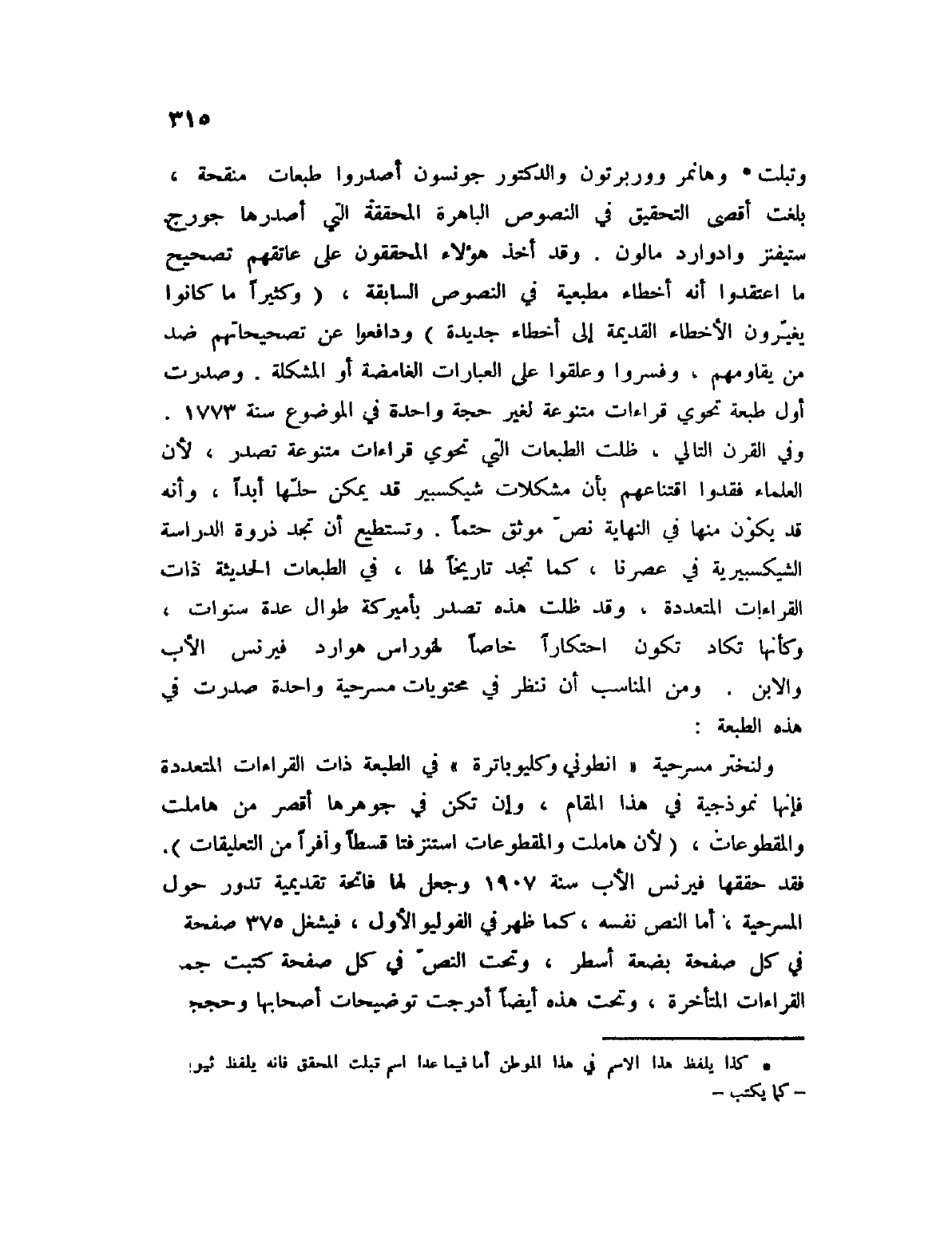 وتبلت (1) وهانمر ووربرتون والدكتور جونسون أصدروا طبعات منقحة، بلغت أقصى التحقيق ي النصوص الباهرة المحققة التي أصدرها جورج ستيفنز وادوارد مالون. وقد أخذ هؤلاء الحققون على عاتقهم تصحيح ما اعتقدوا أنه أخطاء مطبعية في النصوص السابقة، (وكثيراً ما كانوا يغيرون الأخطاء القديمة إلى أخطاء جديدة) ودافعوا ن تصحيحاتهم ضد من يقاومهم، وفسروا وعلقوا على العبارات الغامضة أو المشكلة. وصدرت أول طبعة تحوي قراءات متنوعة لغير حجة واحدة في الموضوع سنة 1773. وفي القرن التالي، ظلت الطبعات التي تحوي قراءات متنوعة تصدر، لأن العلماء فقدوا اقتناعهم بان مشكلات شيكسبير قد يكن حلها أبداً، وأنه قد يكون منها في النهاية نص موثق حتماً. وتستطيع أن تجد ذروة الدراسة الشيكسبيرية في عصرنا، كما تجد تاريخاً لها، في الطبعات الحديثة ذات القراءات المتعددة، وقد ظلت هذه تصدر بأميركة طوال عدة سنوات، وكأنها تكاد تكون احتكاراً خاصاً لهوراس هوارد فيرنس الأب والابن. ومن المناسب أن ننظر في محتويات مسرحية واحدة صدرت ي هذه الطبعة.