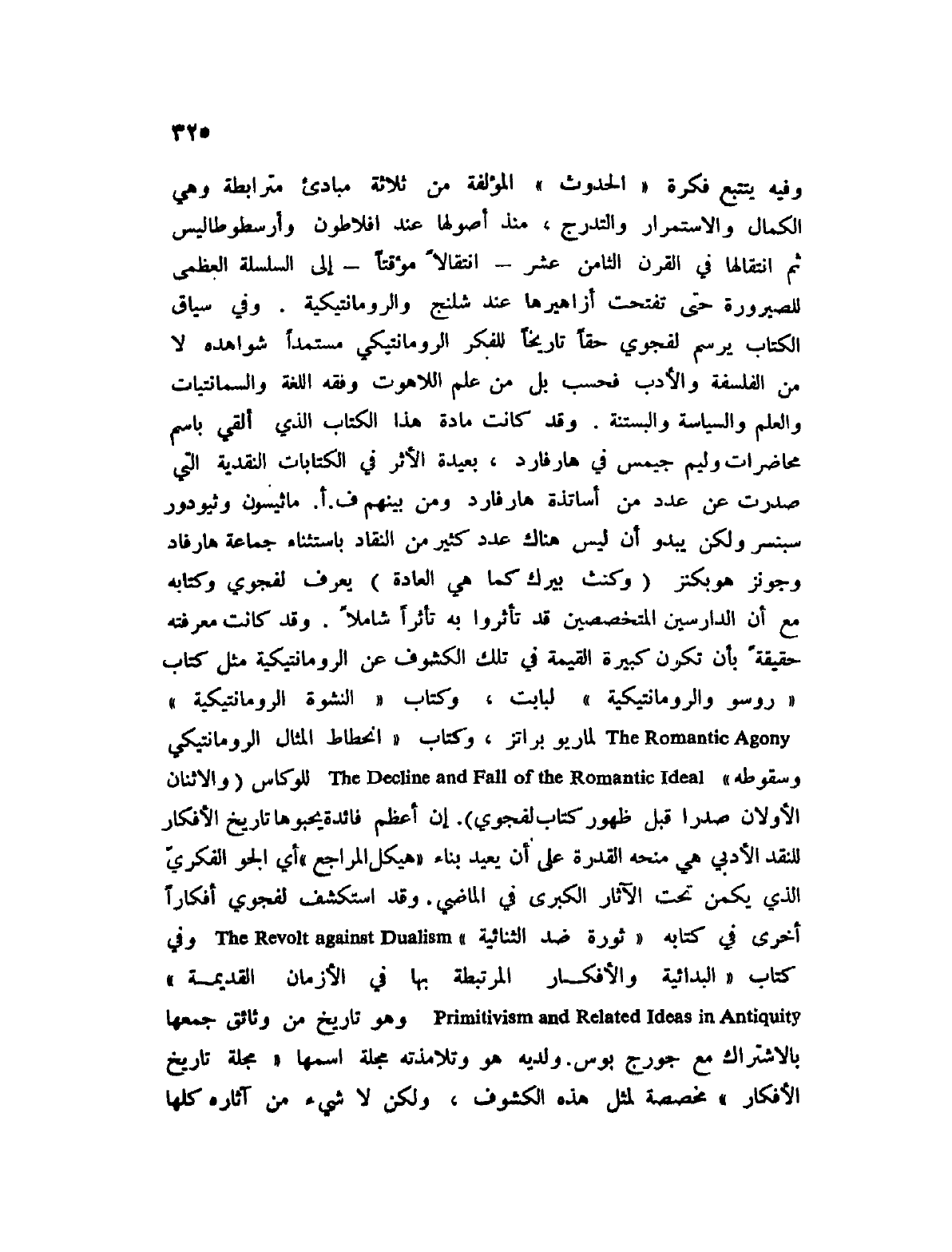 وفيه يتتبع فكرة " الحدوث " المؤلفة من ثلاثة مبادئ مترابطة وهي الكمال والاستمرار والتدرج، منذ أصولها عند أفلاطون وأرسطوطاليس ثم انتقالها في القرن الثامن عشر؟ انتقالاً مؤقتاً؟ إلى السلسلة العظمى للصيرورة حتى تفتحت أزاهيرها عند شلنج والرومانتيكية. وفي سياق الكتاب يرسم لفجوي حقاً تاريخياً للفكر الرومانتيكي مستمداً شواهده لا من الفلسفة والأدب فحسب بل من علم اللاهوت وفقه اللغة والسمانتيات والعلم والسياسة والبستنة. وقد كانت مادة هذا الكتاب الذي ألقي باسم محاضرات وليم جيمس في هارفارد، بعيدة الأثر في الكتابات النقدية التي صدرت عن عدد من أساتذة هارفارد ومن بينهم ف. أ. ماثيسون وثيودور سبنسر ولكن يبدو أن ليس هناك عدد كثير من النقاد باستثناء جماعة هارفاد وجونز هوبكنز (وكنث بيرك كما هي العادة) يعرف لفجوي وكتابه مع أن الدارسين المتخصصين قد تأثروا به تأثراً شاملاً. وقد كانت معرفته حقيقة بأن تكون كبيرة القيمة في تلك الكشوف عن الرومانتيكية مثل كتاب " روسو والرومانتيكية " لبابت، وكتاب طالنشوة الرومانتيكية " The Romantic Agony لماريو براتز، وكتاب " انحطاط المثال الرومانتيكي وسقوطه " The Decline and Fall of the Romantic Ideal للوكاس (والاثنان الأولان صدرا قبل ظهور كتاب لفجوي) . إن أعظم فائدة يحبوها تاريخ الأفكار للنقد الأدبي هي منحه القدرة على أن يعيد بناء " هيكل المراجع " أي الجو الفكري الذي يكمن تحت الآثار الكبرى في الماضي. وقد استكشف لفجوي أفكاراً أخرى في كتابه " ثورة ضد الثنائية " The Revolt against Dualism وفي كتاب " البدائية والأفكار المرتبطة بها في الأزمان القديمة " Primitivism and Related Ideas in Antiquity وهو تاريخ من وثائق جمعها بالاشتراك مع جورج بوس. ولديه هو وتلامذته مجلة اسمها " مجلة تاريخ الأفكار " مخصصة لمثل هذه الكشوف، ولكن لا شيء من آثاره كلها