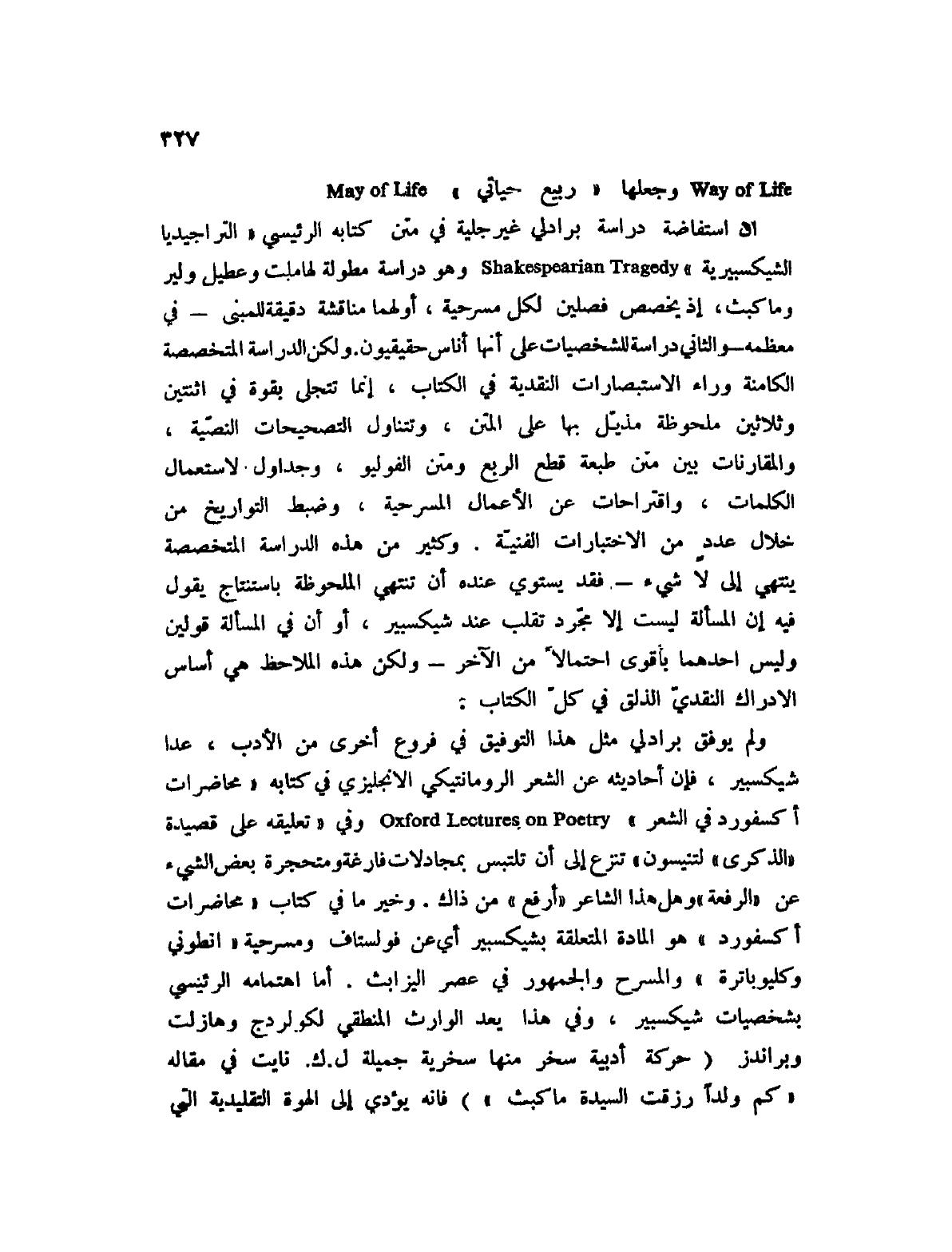 إن استفاضة دراسة برادلي غير جلية في متن كتابه الرئيسي " التراجيديا الشكسبيرية " Shakespearian Tragedy وهو دارسة مطولة لهاملت وعطيل ولير وماكبث، إذ يخصص فصلين لكل مسرحية، أولهما مناقشة دقيقة للمبنى؟ في معظمه؟ والثاني دراسة للشخصيات على أنها أناس حقيقيون. ولكن الدراسة المتخصصة الكامنة وراء الاستبصارات النقدية في الكتاب، إنما تتجلى بقوة في اثنتين وثلاثين ملحوظة مذيل بها على المتن، وتتناول التصحيحات النصية، والمقارنات بين متن طبعة قطع الربع ومتن الفوليو، وجداول لاستعمال الكلمات، واقتراحات عن الأعمال المسرحية، وضبط التواريخ من خلال عددٍ من الاختبارات الفنية. وكثير من هذه الدراسة المتخصصة ينتهي إلى لا شيء؟ فقد يستوي عنده أن تنتهي الملحوظة باستنتاج يقول فيه إن المسألة ليست إلا مجرد تقلب عند شيكسبير، أو أن في المسألة قولين وليس أحدهما بأقوى احتمالاً من الآخر؟ ولكن هذه الملاحظ هي أساس الإدراك النقدي الذلق في كل الكتاب.