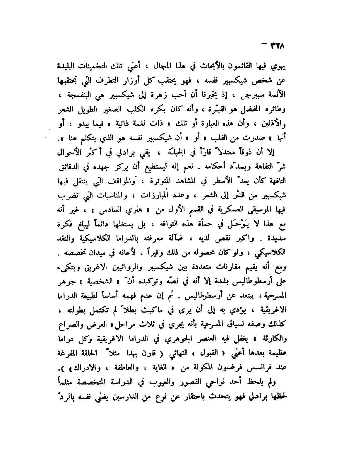 إلا أن ذوقاً معتدلاً قاراً في الجبلة، يقي برادلي في أكثر الأحوال شر التفاهة ويسدد أحكامه. نعم إنه ليستطيع أن يركز جهده في الدقائق التافهة كأن يعد الأسطر في المشاهد المتوترة، والمواقف التي ينتقل فيها شيكسبير من النثر إلى الشعر، وعدد المبارزات، والمناسبات التي تضرب فيها الموسيقى العسركية في القسم الأول من " هنري السادس "، غير أنه مع هذا لا يوحل في حمأة هذه التوافه، بل يستغلها دائماً ليبلغ فكرة سديدة. وأكبر نقص لديه، ضآلة معرفته بالدراما الكلاسيكية والنقد الكلاسيكي، ولو كان محصوله من ذلك وفيراً، لأعانه في ميدان تخصصه. ومع أنه يقيم مقارنات متعددة بين شيكسبير والروائيين الإغريق ويتكئ على أرسطوطاليس بشدة إلا أنه في نصه وتوكيده أن " الشخصية " جوهر المسرحية، يبتعد عن أرسطوطاليس. ثم إن عدم فهمه أساساً لطبيعة الدراما الإغريقية، يؤدي به إلى أن يرى في ماكبث بطلاً لم تكتمل بطولته، كذلك وصفه لسياق المسرحية بأنه يجري في ثلاث مراحل " العرض والصراع والكارثة " يغفل فيه العنصر الجوهري في الدراما الإغريقية وكل دراما عظيمة بعدها أعني " القبول " النهائي (قارن بهذا مثلاً الحلقة المفرغة عند فرانسس فرغسون المكونة من " الغاية، والعاطفة، والإدراك ") .