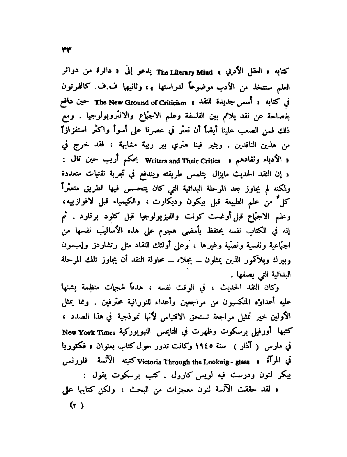 كتابه " العقل الأدبي " The Literary Mind يدعو إلى " دائرة من دوائر العلم ستتخذ من الأدب موضوعاً لدراستها "، وثانيهما ف. ف. كالفرتون في كتابه " أسس جديدة للنقد " The New Ground of Criticism حين دافع بفصاحة عن نقد يلائم بين الفلسفة وعلم الاجتماع والانثروبولوجيا. ومع ذلك فمن الصعب علينا أيضاً أن نعثر في عصرنا على أسوأ واكثر استفزازاً من هذين الناقدين. ويثير فينا هنري بير ريبة مشابهة، فقد خرج في " الأدباء ونقادهم " Writers and Their Critics بحكم أريب حين قال: " إن النقد الحديث ما يزال يتلمس طريقته ويندفع في تجربة تقنيات متعددة ولكنه لم يجاوز بعد المرحلة البدائية التي كان يتحسس فيها الطريق متعثراً كل من علم الطبيعة قبل بيكون وديكارت، والكيمياء قبل لافوازييه، وعلم الاجتماع قبل أوغست كونت والفزيولوجيا قبل كلود برنارد. ثم إنه في الكتاب نفسه يحتفظ بأمضى هجوم هذه الأساليب نفسها من اجتماعية ونفسية ونصية وغيرها، وعلى أولئك النقاد مثل رتشاردز وإمبسون وبيرك وبلاكمور الذين يمثلون؟ بجلاء؟ محاولة النقد أن يجاوز تلك المرحلة البدائية التي يصفها.