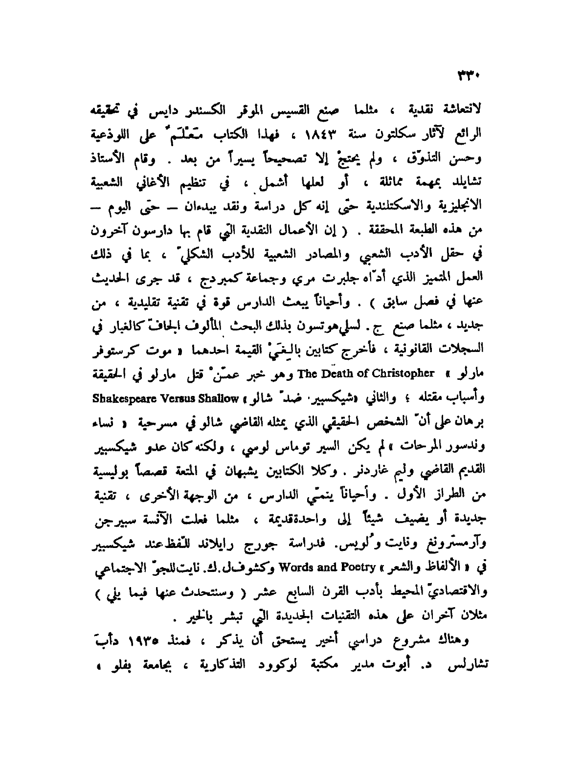 لانتعاشة نقدية، مثلما صنع القسيس الموقر الكسندر دايس في تحقيقه الرائع لآثار سكلتون سنة 1843، فهذا الكتاب معلم على اللوذعية وحسن التذوق، ولم يحتج إلا تصحيحاً يسيراً من بعد. وقام الأستاذ تشايلد بمهمة مماثلة، أو لعلها اشمل، في تنظيم الأغاني الشعبية الإنجليزية والاسكتلندية حتى إنه كل دراسة ونقد يبدءان؟ حتى اليوم؟ من هذه الطبعة المحققة. (إن الأعمال النقدية التي قام بها دارسون آخرون في حقل الأدب الشعبي والمصادر الشعبية للأدب الشكلي، بما في ذلك العمل المتميز الذي أداه جلبرت مري وجماعة كمبردج، قد جرى الحديث عنها في فصل سابق) . وأحيانا يبعث الدارس قوة في تقنية تقليدية، من جديد، مثلما صنع ج. لسلي هوتسون بذلك البحث المألوف الجاف كالغبار في السجلات القانونية، فأخرج كتابين بالغي القيمة أحدهما " موت كرستوفر مارلو " The Death of Christopher وهو خبر عمن قتل مارلو في الحقيقة وأسباب مقتله؛ والثاني " شيكسبير ضد شالو " Shakespeare Versus Shallow برهان على أن الشخص الحقيقي الذي يمثله القاضي شالو في مسرحية " نساء وندرسو المرحات " لم يكن السير توماس لوسي، ولكنه كان عدو شيكسبير القديم القاضي وليم غاردنر. وكلا الكتابين يشبهان في المتعة قصصا بوليسية من الطراز الأول. وأحيانا ينمي الدارس، من الوجهة الأخرى، تقنية جديدة أو يضيف شيئا إلى واحدة قديمة، مثلما فعلت الآنسة سبيرجن وآرمسترونغ ونايت ولوليس. فدراسة جورج رايلاند للفظ عند شيكسبير في " الألفاظ والشعر " Wards and Potery وكشوف ل. ك. نايت للجو الاجتماعي والاقتصادي المحيط بأدب القرن السابع عشر (وسنتحدث عنها فيما يلي) مثلان آخران على هذه التقنيات الجديدة التي تبشر بالخير.