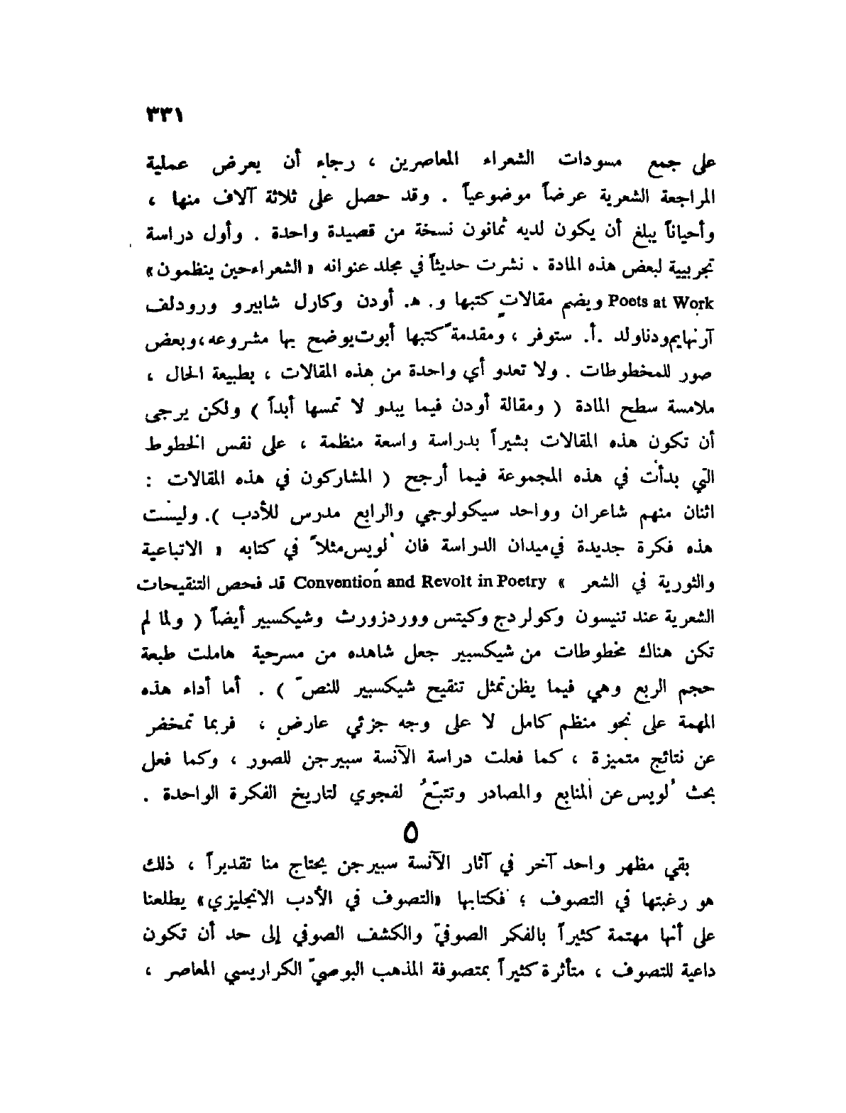 على جمع مسودات الشعراء المعاصرين، رجاء أن يعرض عملية المراجعة الشعرية عرضا موضوعيا. وقد حصل ثلاثة آلاف منها، وأحيانا يبلغع أن يكون لديه ثمانون نسخة من قصيدة واحدة. وأول دراسة تجريبية لبعض هذه المادة، نشرت حديثا في مجلد عنوانه " الشعراء حين ينظمون " Potes at Work ويضم مقالات كتبها و. هـ؟؟. أودن وكارل شابير ورودلفق آرنهايم ودونالد. أ. ستوفر، ومقدمة كتبها أبوت يوضح بها مشروعه، وبعض صور للمخطوطات. ولا تعدو أي واحدة من هذه المقالات، بطبيعة الحال، ملامسة سطح المادة (ومقالة أودن فيما يبدو لا تسمها أبدا) ولكن يرجى أن تكون هذه المقالات بشيرا بدراسة واسعة منظمة، على نفس الخطوط التي بدأت في هذه المجموعة فيما أرجح (المشاركون في هذه المقالات: اثنان منهم شاعران وواحد سيكولوجي والرابع مدرس للأدب) . وليست هذه فكرة جديدة في ميدان الدراسة فإن لويس مثلا في كتابه " الاتباعية والثورية في الشعر " Convention and Revolt in Potery قد فحص التنقيحات الشعرية عند تنيسون وكولردج وكيتس ووردزورث وشيكسبير أيضاً (ولما لم تكن هناك مخطوطات من شيكسبير جعل شاهده من مسرحية هاملت طبعة حجم الربع وهي فيما يظن تمثل تنقيح شيكسبير للنص) . أما أداء هذه المهمة على نحو منظم كامل لا على وجه جزئي عارض، فربما تمخض عن نتائج متميزة، كما فعلت دراسة الآنسة سبيرجن للصور، وكما فعل بحث لويس عن المنابع والمصادر وتتبع لفجوي لتاريخ الفكرة الواحدة.