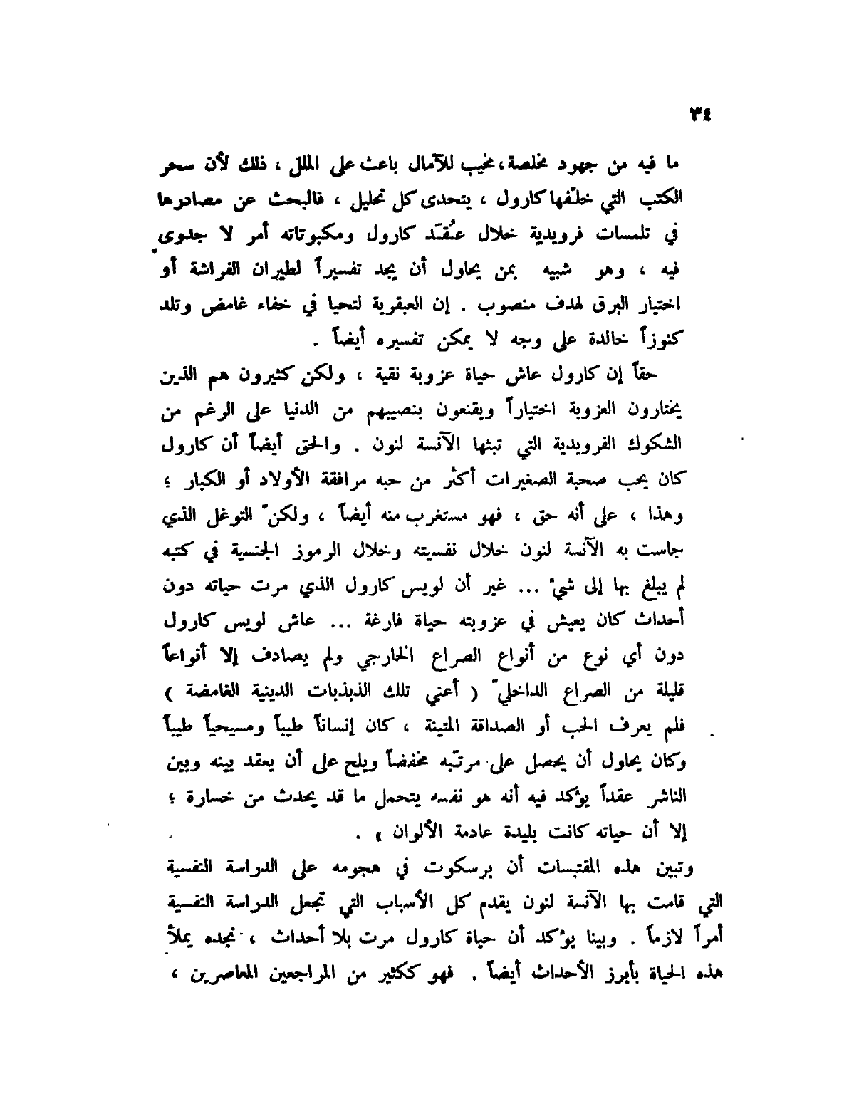 ما فيه من جهود مخلصة، مخيب للآمال باعث على الملل، ذلك لأن سحر الكتب التي خلفها كارول، يتحدى كل تحليل، فالبحث عن مصادرها في تلمسات فرويدية خلال عقد كارول ومكبوتاته أمر لا جدوى فيه، وهو شبيه بمن يحاول أن يجد تفسيراً لطيران الفراشة أو اختيار البرق لهدف منصوب، إن العبقرية لتحيا في خفاء غامض وتلد كنوزاً خالدة على وجه لا يمكن تفسيره أيضاً.