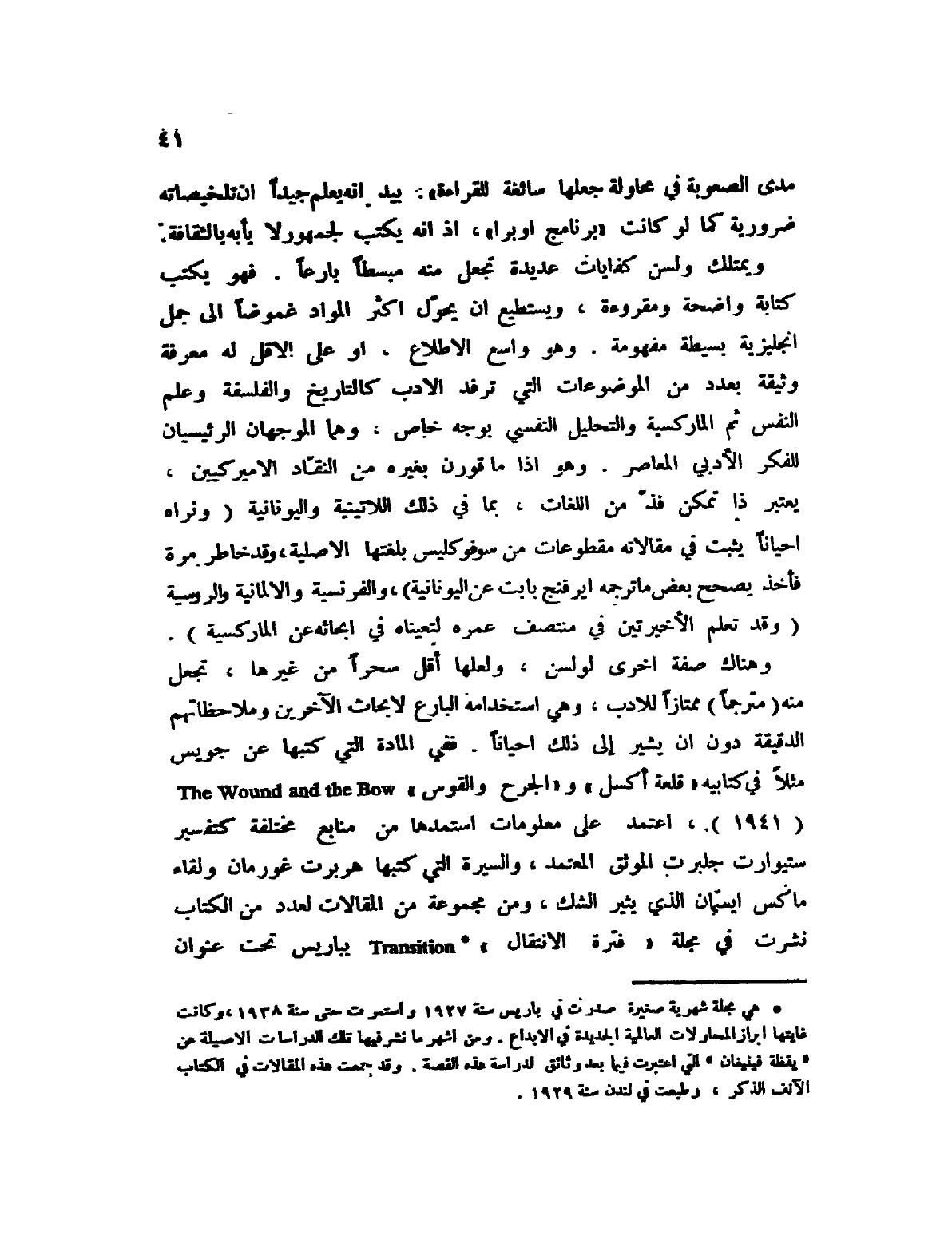 (1) هي مجلة صغيرة صدرت في باريس سنة 1927 واستمرت حتى سنة 1938، وكانت غايتها إبراز المحاولات العالمية الجديدة في الإبداع. ومن أشهرها انشر فيها تلك الدراسات الأصيلة عن " يقظة فينيغان " التي اعتبرت فيما بعد وثائق لدراسة هذه القصة. وقد جمعت هذه المقالات في الكتاب الآنف الذكر، وطبعت في لندن سنة 1929.