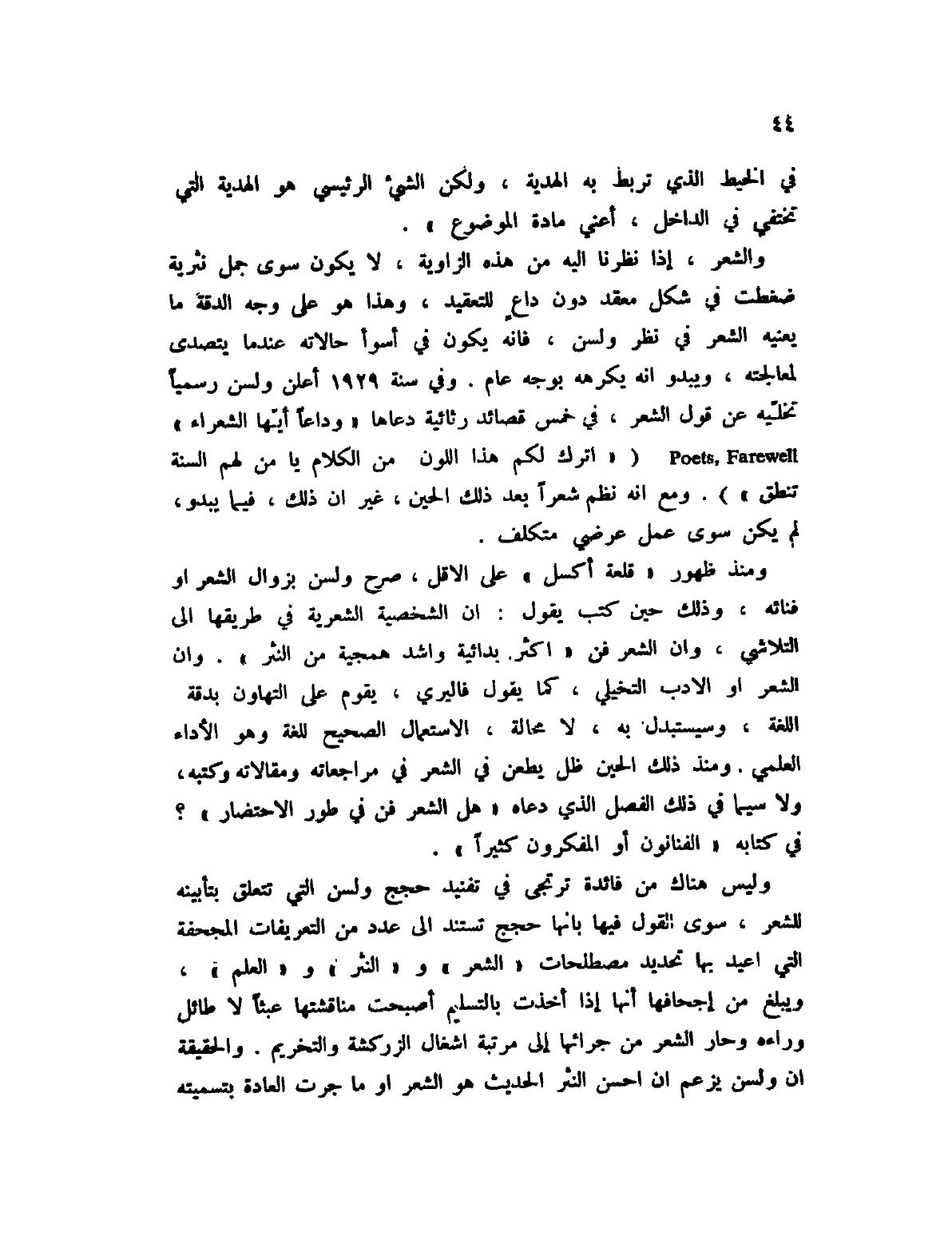 وليس هناك من فائدة ترتجى في تفنيد حجج ولسن التي تتعلق بتأبينه للشعر، سوى القول فيها بأنها حجج تستند إلى عدد من التعريفات المجحفة التي أعيد بها تحديد مصطلحات " الشعر " و " النثر " و " العلم "، ويبلغ من إجحافه أنها إذا أخذت بالتسليم أصبحت مناقشتها عبثاً لا طائل وراءه وحار الشعر من جرائها إلى مرتبة أشغال الزركشية والتخريم. والحقيقة أن ولسن يزعم أن أحسن النثر الحديث هو الشعر أو ما جرت العادة بتسميته