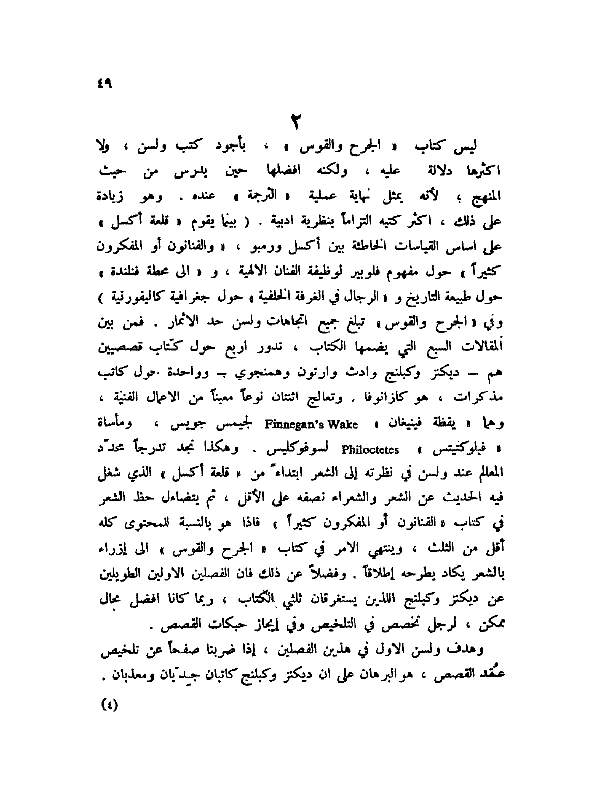 2 - ليس كتاب " الجرح والقوس "، بأجود كتب ولسن، ولا أكثرها دلالة عليه، ولكنه افضلها حين يدرس من حيث المنهج، نه يمثل نهاية عملية " الترجمة " عنده. وهو زيادة على ذلك، اكثر كتبه التزاماً بنظرية أدبية. (بينما يقوم " قلعة أكسل " على أساس القياسات الخاطئة بين أكسل ورومبو، " والفنانون أو المفكرون كثيراً " حول مفهوم فلوبير لوظيفة الفنان الإلهية، و " إلى محطة فنلندة " حول طبيعة التاريخ و " الرجال في الغرفة الخلفية " حول جغرافية كاليفورنية) وفي " الجرح والوقس " تبلغ جميع اتجاهات ولسن حد الأثمار. فمن بين المقالات السبع التي يضمها الكتاب، تدور أربع حول كتاب قصصين هم؟ ديكنز وكبلنج وادث وارتون وهمنجوي؟ وواحدة حول كاتب مذكرات، وهو كازانوفا. وتعالج اثنتان نوعاً معيناً من الأعمال الفنية، وهما " يقظة فينيغان " Finnegan " s Wake لجيمس جويس، ومأساة " فيلوكتيتس " Philoctetes لسوفوكليس. وهكذا نجد تدرجاً محدد المعالم عند ولسن في نظرته إلى الشعر ابتداءً من " قلعة أكسل " الذي شغل فيه الحديث عن الشعر والشعراء نصفه على الأقل، ثم يتضاءل حظ الشعر في كتاب " الفنانون أو المفكرون كثيراً " فإذا هو بالنسبة للمحتوى كله أقل من الثلث، وينتهي الأمر في كتاب " الجرح والقوس " إلى إزراء بالشعر يطرحه إطلاقاً. وفضلاً عن ذلك فإن الفصلين الأولين الطويلين عن ديكنز وكبلنج اللذين يستغرقان ثلثي الكتاب، ربما كانا افضل مجال ممكن، برجل تخصص في التلخيص وفي إيجاز حبكات القصص.