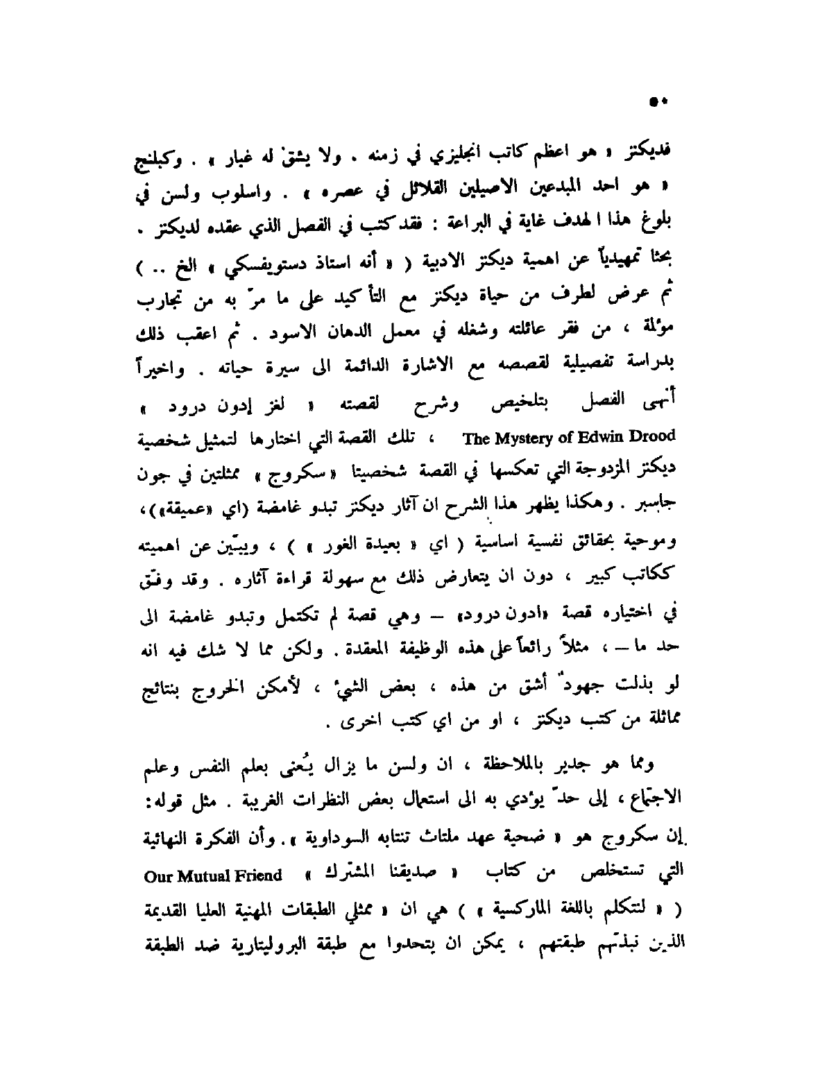 ومما هوة جدير بالملاحظة، أن ولسن ما يزال يعنى بعلم النفس وعلم الأجتماع، إلى حد يؤدي به إلى استعمال بعض النظرات الغريبة. مثل قوله: إن سكروج هو " ضحية عهد ملتاث تنتابه السوداوية ". وأن الفكرة النهائية التي تستخلص من كتاب " صديقنا المشترك " Oue Mutual Friend (" لنتكلم باللغة الماركسية ") هي أن " ممثلي الطبقات المهنية العليا القديمة الذين نبذتهم طبقتهم، يمكن أن يتحدوا مع طبقة البروليتارية ضد الطبقة