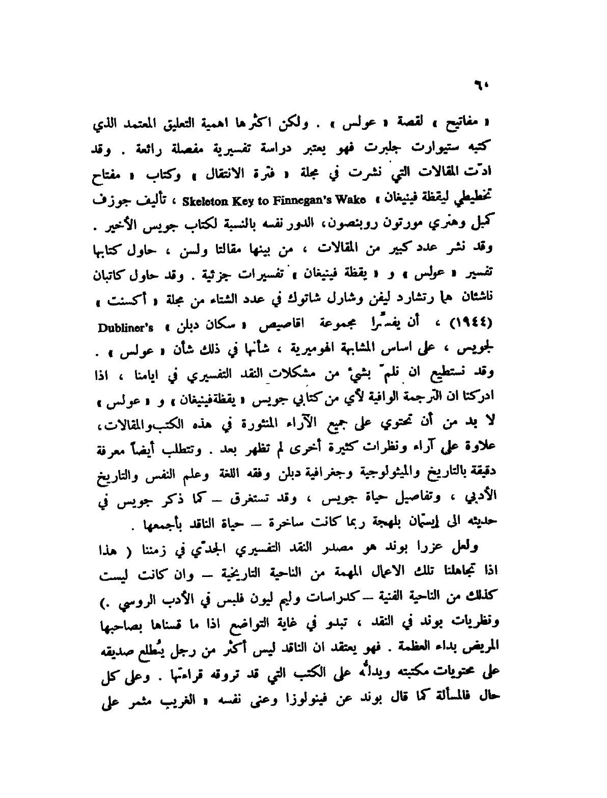 " مفاتيح " لقصة " عولس ". ولكن أكثرها أهمية التعليق المعتمد الذي كتبه ستيوارت جبرت فهو يعتبر دراسة تفسيرية مفصلة رائعة. وقد أدت المقالات التي نشرت في مجلة " فترة الانتقال " وكتاب " مفتاح تخطيطي ليقظة فينيغان " Skeleton Key to Finnegan " s Wake، تأليف جوزف كمبل وهنري مورتون روبنصون، الدور نفسه بالنسبة لكتاب جويس الأخير، قد نشر عدد كبي من المقالات، من بينها مقالتا ولسن، حاول كتابها تفسير " عولس " و " يقظة فينيغان " تفسيرات جزئية. وقد حاول كاتبان ناشئان هما رتشارد ليفن وشارل شاتوك في عدد الشتاء من مجلة " أكسنت " (1944) ، أن يفسروا مجموعة أقاصيص " سكان دبلن " Dubliner " s لجويس، على أساس المشابهة الهوميرية، شأنها في ذلك شأن " عولس ". وقد نستطيع أن نلم بشيء من مشكلات النقد التفسيري في أيامنا، إذا أدركنا أن الترجمة الوافية لأي من كتابي جويس " يقظة فينيغان " و " عولس " لا بد من أن تحتوي على جميع الآراء المنثورة في هذه الكتب والمقالات، علاوة على آراء ونظرت كثيرة أخرى لم تظهر بعد. وعلم النفس والتاريخ الأدبي، وتفاصيل حياة جويس، وقد تستغرق؟ كما ذكر جويس في حديثه إلى إيسمان بلهجة ربما كانت ساخرة؟ حياة الناقد بأجمعها.