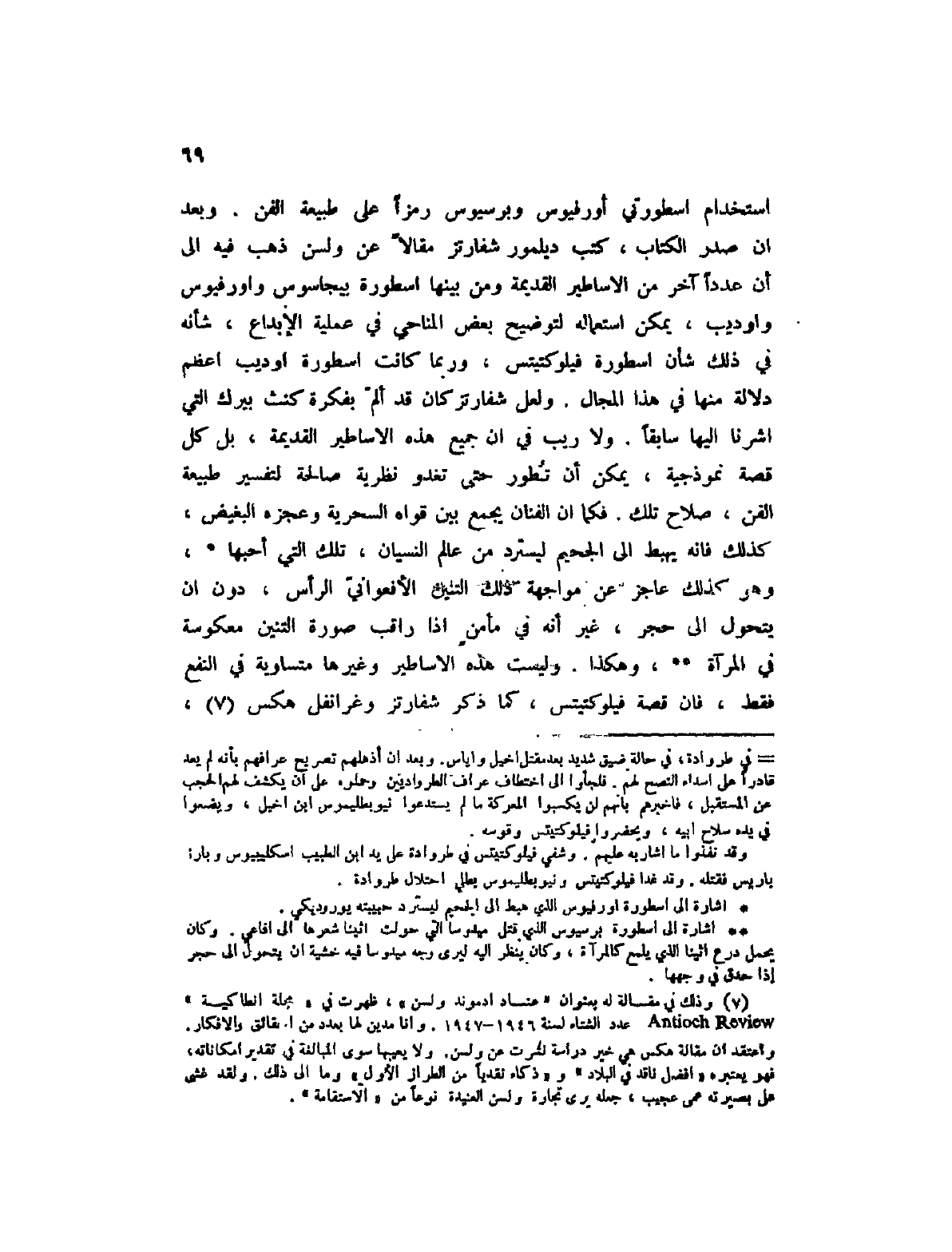 استخدام أسطورتي أورفيوس وبرسيوس رمزا على طبيعة الفن. وبعد أن صدر الكتاب، كتب ديلمور شفارتز مقالا عن ولسن ذهب فيه إلى أن عددا من الأساطير القديمة ومن بينها بيجاسوس واورفيوس وأوديب، يمكن استعماله لتوضيح بعض المناحي في عملية الإبداع، شأنه في ذلك شأن أسطورة فيلوكتيتس، وربما كانت أسطورة أوديب أعظم دلالة منها في هذا المجال. ولعل شفارتز كان قد ألم بفكرة كنث بيرك التي أشرنا إليها سابقا. ولا ريب في أن جميع هذه الأساطير القديمة، بل كل قصة نموذجية، يمكن أن تطور حتى تغدو نظرية صالحة لتفسير طبيعة الفن، صلاح تلك. فكما أن الفنان يجمع بين قواه السحرية وعجزه البغيض، كذلك فإنه يهبط إلى الجحيم ليسترد من عالم النسيان، تلك التي أحبها (1) ، وهو كذلك عاجز عن مواجهة ذلك التنين الأفعواني الرأس، دون أن يتحول إلى حجر، غير أنه في مأمن إذا راقب صورة التنين معكوسة في المرآة (2) ، وهكذا. وليست هذه الأساطير وغرها متساوية في النفع فقط، فإن قصة فيلوكتيتس، كما ذكر شفارتز وغرانفل هكس (3) ،