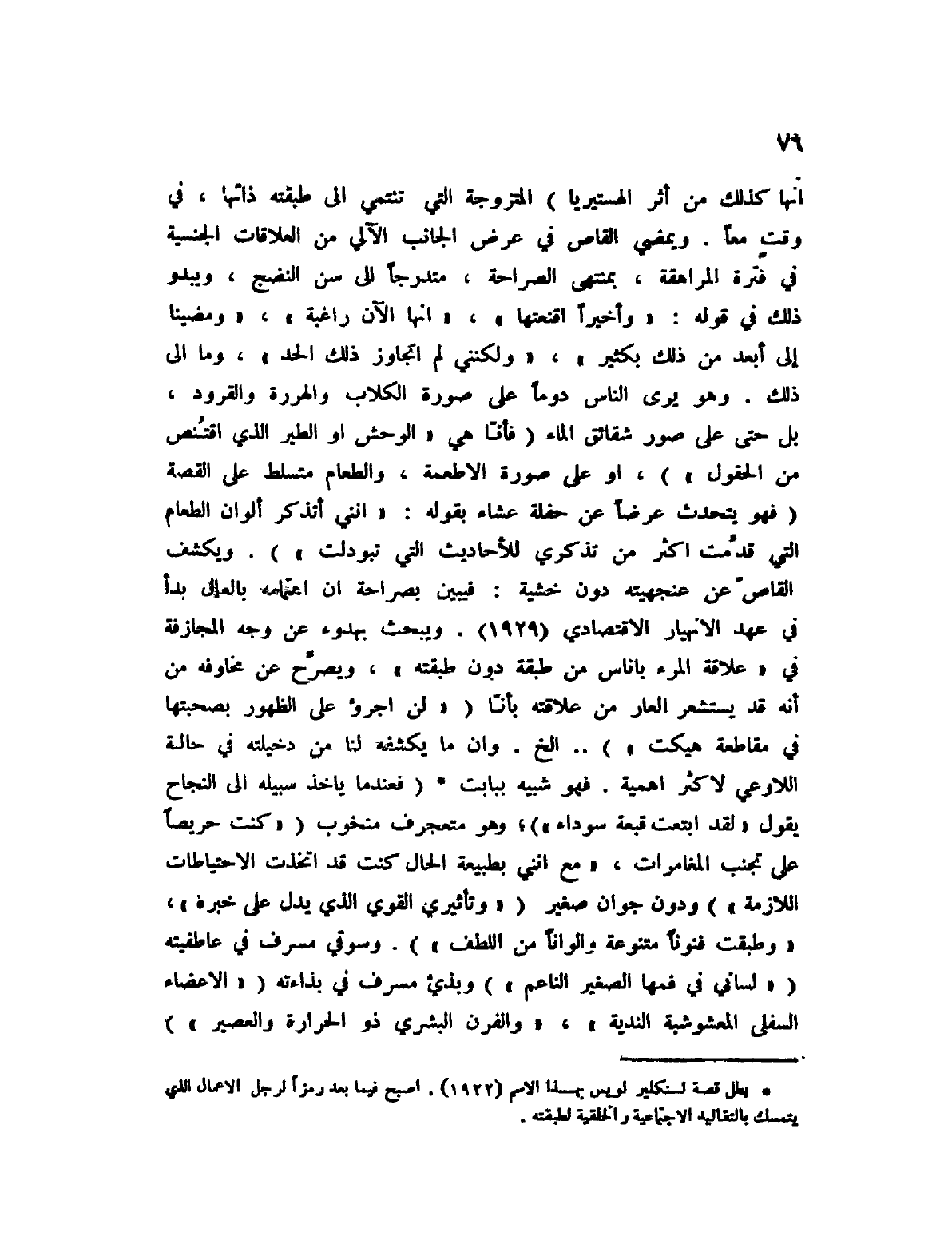 أنها كذلك من أثر الهستيريا) المتزوجة التي تنتمي إلى طبقة ذاتها، في وقت معا. ويمضي القاص في عرض الجانب الآلي من العلاقات الجنسية في فترة المراهقة، بمنتهى الصراحة، متدرجا إلى سن النضج، ويبدو ذلك في قوله: " وأخيرا أقنعتها "، أنها الآن راغبة "، " ومضينا إلى ابعد من ذلك بكثير "، " ولكنني لم أتجاوز ذلك الحد "، وما إلى ذلك. وهو يرى الناس دوما على صورة الكلاب والهررة والقرود، بل حتى على صور شقائق الماء (فأنا هي " الوحش أو الطير الذي اقتنص من الحقول ") ، أو على صورة الأطعمة، والطعام متسلط على القصة (فهو يتحدث عرضا عن حفلة عشاء بقوله: " إنني أتذكر ألوان الطعا التي قدمت أكثر من تذكيري للأحاديث التي تبودلت ") . ويكشف القاص عن عنجهيته دون خشية: فيبين بصراحة أن اهتمامه بالعمال بدأ في الانهيار الاقتصادي (1929) . ويبحث بهدوء عن وجه بالمجازفة في " علاقة المرء بأناس من طبقة دون طبقته "، ويصرح عن مخاوفه من أنه قد يستشعر العار من علاقته بأنا (" لن أجرؤ على الظهور بصحبتها في مقاطعة هيكت ") .. الخ. وإن ما يكشفه لنا من دخيلته في حالة اللاوعي لأكثر أهمية. فهو شبيه ببابت (1) (فعندما يأخذ سبيله إلى النجاح يقول " لقد ابتعت قبعة سوداء ") ؛ وهو متعجرف منخوب (" كنت حريصا على تجنب المغامرات "، " مع أنني بطبيعة الحال كنت قد اتخذت الاحتياطات اللازمة ") ودون جوان صغير (" وتأثيري القوي الذي يدل على خبرة "، " وطبقت فنونا متنوعة وألونا من اللطف ") . وسوقي مسرف في عاطفيته (" لساني في فمها الصغير الناعم ") وبذيء مسرف في بذاءته (" الأعضاء السفلى العشوشبة الندية "، " والفرن البشري ذو الحرارة والعصير ")