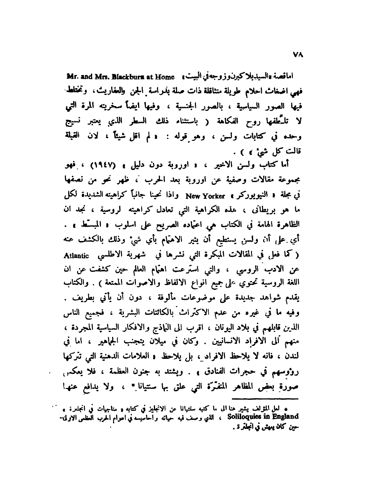 (1) لعل المؤلف يشير هنا إلى ما كتبه عن الإنجليز في كتابه " مناجيات في إنجلترة " Soliloquies in England، الذي وصف حيه حياته وأحاسيسه في أعوام الحرب العظمى الأولى حين كان يعيش في إنجلترة.