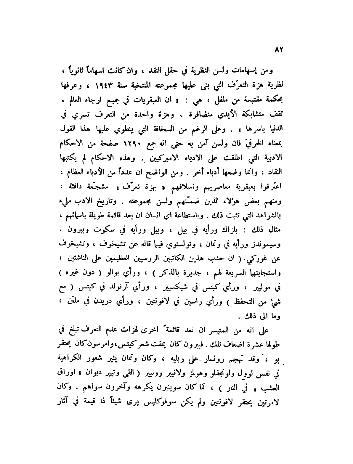 على أنه من المتيسر أن نعد قائمة أخرى لهزات عدم التعرف تبلغ في طولها عشرة أضعاف تلك. فبيرون كان يمقت شعر كيتس، وامرسون كان يحتقر يو، وقد تهجم رونسار على ربليه، وكان وتمان يثير شعور الكراهية في نفس لوول ولونجفلو وهلمز ولانيير ووتيير (ألقى وتيير ديوان " أوراق العشب " في النار) ، كما كان سوينبرن يكرهه وآخرون سواهم. وكان لامرتين يحتقر لافونتين ولم يكن سوفوكليس يرى شيئا ذا قيمة في آثار