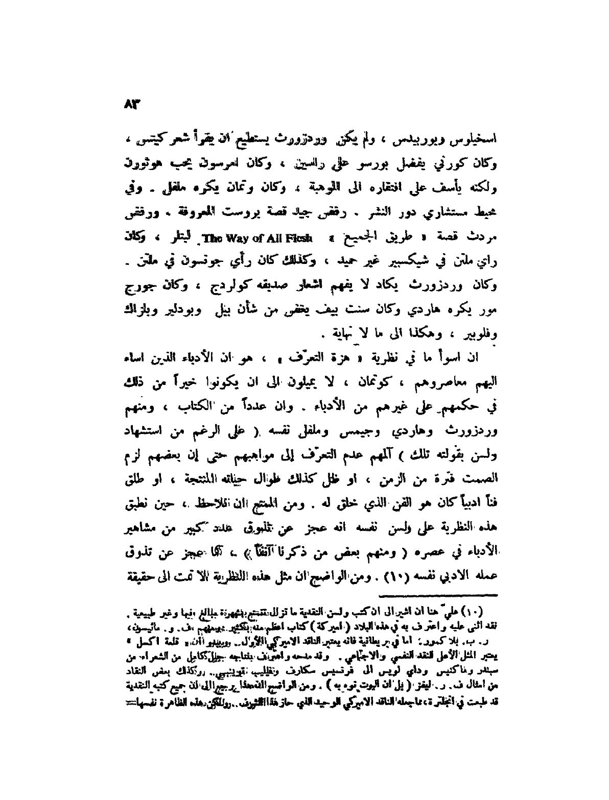 (1) علي هنا أن أشير إلى أن كتب ولسن النقدية ما تزال تتمتع بشهرة مبالغ فيها وغير طبيعية. فقد أثنى عليه واعترف به في هذه البلاد (أميركة) كتاب أعظم منه بكثير: ومنهم ف. و. ماثيسون، ر. ب. بلاكمور. أما في بريطانية فإنه يعتبر الناقد الأميركي الأول. ويبدو أن " قلعة اكسل " يعتبر المثل الأعلى للنقد النفسي والاجتماعي. وقد مدحه واعترف بنتاجه جيل كامل من الشعراء من سبندر وماكنيس وداي لويس إلى فرنسيس سكارف وفيليب توينبي. وكذلك بعض النقاد من أمثال ف. ر. ليفز (بل أن اليوت نوه به) . ومن الواضح أن هذا يرجع إلى أن جميع كتبه النقدية قد طبعت في إنجلترة، مما جعله الناقد الأميركي الوحيد الذي حاز هذا الشرف. ولكن هذه الظاهرة نفسها تحتاج تفسيرا. ومهما تكن الأسباب فإننا نأمل أن يتغير هذا الوضع الذي جعل من ولسن الناقد الأميركي الحي الوحيد الذي يعرف الكتاب الأنجليز آثاره، بينما لا يعرفون آثار كنث بيرك وبلاكمور في الأكثر.