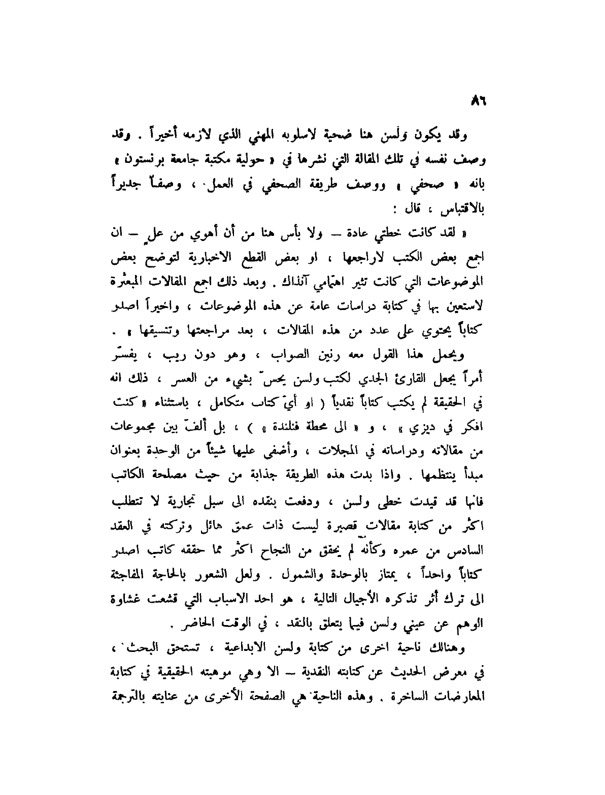 " لقد كانت خطتي عادة؟ ولا بأس هنا من أن أهوي من عل؟ أن أجمع بعض الكتب لأراجعها، أو بعض القطع الإخبارية لتوضح بعض الموضوعات التي كانت تثير اهتمامي آنذاك. وبعد ذلك أجمع المقالات المبعثرة لأستعين بها في كتابة دراسات عامة عن هذه الموضوعات، وأخيرا أصدر كتابا يحتوي على عدد من هذه المقالات، بعد مراجعتها وتنسيقها ".