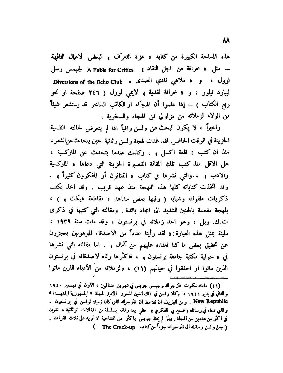 (1) مات سكوت فتزجرالد وجيمس جويس في شهرين متتاليين، الأول في ديسمبر 1940 والثاني في يناير 1941، وكان ولسن في ذلك الحين المحرر الأدبي لمجلة " الجمهورية الجديدة " New Republic. ومن الطريف أن نلاحظ أن فتزجرالد الذي كان زميلا لولسن في برنستون، والذي دعاه في رسائله " ضميري الفكري " حظي بعد وفاته بسلسلة من المقالات الرثائية، نشرت في أكثر من عددين من المجلة. بينما لم يحظ جويس بأكثر من افتتاحية لا تزيد على ثلاث فقرات. (جعل ولسن رسائله إلى فتزجرالد جزءا من كتاب The Creak - up) .