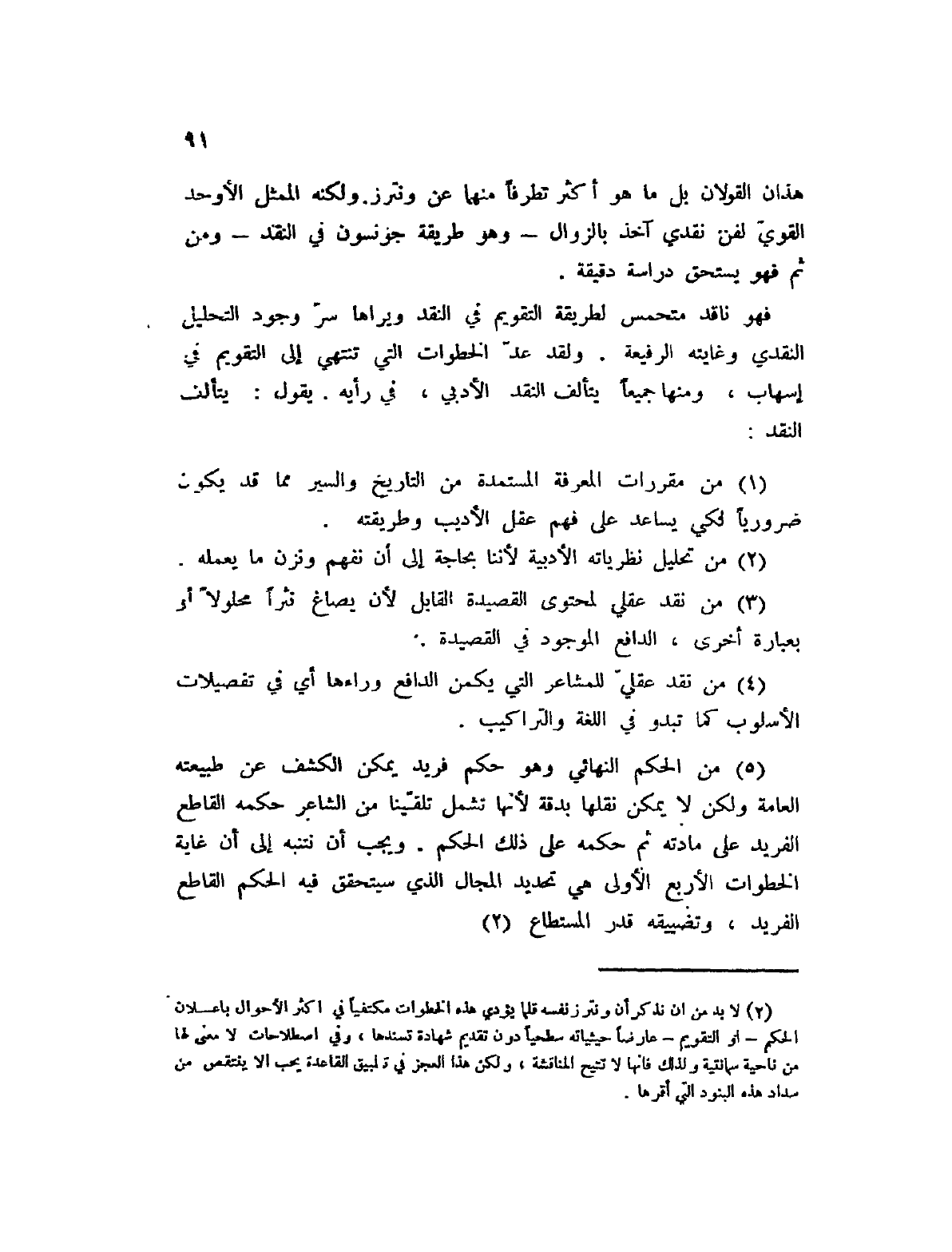 (1) لا بد من أن نذكر أن ونترز نفسه قلما يؤدي هذه الخطوات مكتفيا في أكثر الأحوال بإعلان الحكم - أو التقويم - عارضا حيثياته سطحيا دون تقديم شهادة تسندها، وفي اصطلاحات لا معنى لها من ناحية سمانتية ولذلك لا تتيح المناقشة، ولكن هذا العجز في تطبيق القاعدة يجب ألا ينتقص من سداد هذه البنود التي أقرها.
