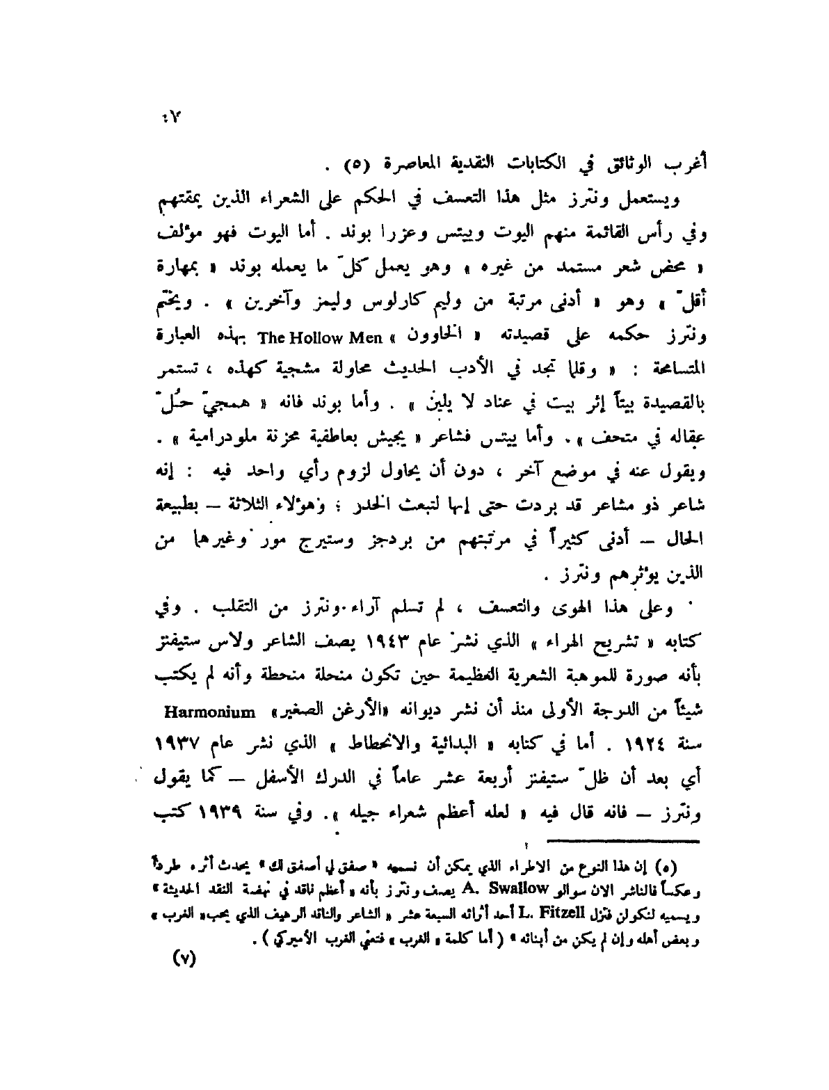 (1) إن هذا النوع من الإطراء الذي يمكن أن نسميه " صفق لي أصفق لك " يحدث أثره طردا وعكسا فالناشر الان سوالو A. Swallow يصف ونترز بأنه " أعظم ناقد في نهضة النقد الحديثة " ويسميه لنكولن فتزل L. Fitzell أحد أثرائه السبعة عشر " الشاعر والناقد الرهيف الذي يحب " الغرب " وبعض أهله وإن لم يكن من أبنائه " (أما كلمة " الغرب " فتعني الغرب الأميركي) .