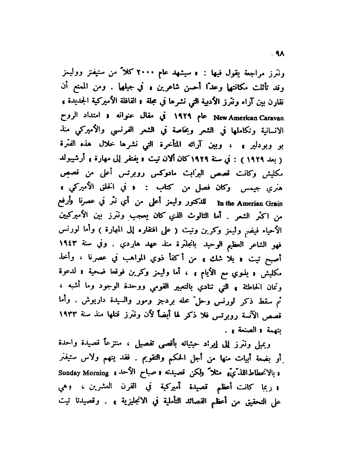 ونترز مراجعة يقول فيها: " سيشهد عام 2000 كلا من ستيفنز ووليمز وقد تأثلت مكانتهما وعدا أحسن شاعرين " في جيلهما. ومن الممتع أن نقارن بين آراء ونترز الأدبية التي نشرها في مجلة " القافلة الأميركية الجديدة " New American Caravan عام 1929 في مقال عنوانه " امتداد الروح الإنسانية وتكاملها في الشعر وبخاصة في الشعر الفرنسي والأميركي منذ بو وبودلير "، وبين آرائه المتأخرة التي نشرها خلال هذه الفترة (بعد 1929) : في سنة 1929 كان ألان تيت " يفتقر إلى مهارة " أرشيبولد مكليش وكانت قصص اليزابيث مادوكس روبرتس أعلى من قصص هنري جيمس وكان فصل من كتاب: " في الخلق الأميركي " In the American Grain للدكتور وليمز أعلى من أي نثر في عصرنا وأرفع من أكثر الشعر. أما الثالوث الذي كان يعجب ونترز بين الأميركيين الأحياء فيضم وليمز وكرين وتيت (على افتقاره إلى المهارة) وأما لورنس فهو الشاعر العظيم الوحيد بإنجلترة منذ عهد هاردي. وفي سنة 1943 أصبح تيت " بلا شك " من أكفأ ذوي المواهب في عصرنا، وأخذ مكليش " يذوي مع الأيام "، أما وليمز وكرين فوقعا ضحية " لدعوة وتمان الخاطئة " التي تنادي بالتعبير القومي ووحدة الوجود وما أشبه، ثم سقط ذكر لورنس وحل محله بردجز ومور والسيدة داريوش. وأما قصص الآنسة روبرتس فلا ذكر لها أيضاً لأن ونترز قتلها منذ سنة 1933 بتهمة " الصنعة ".