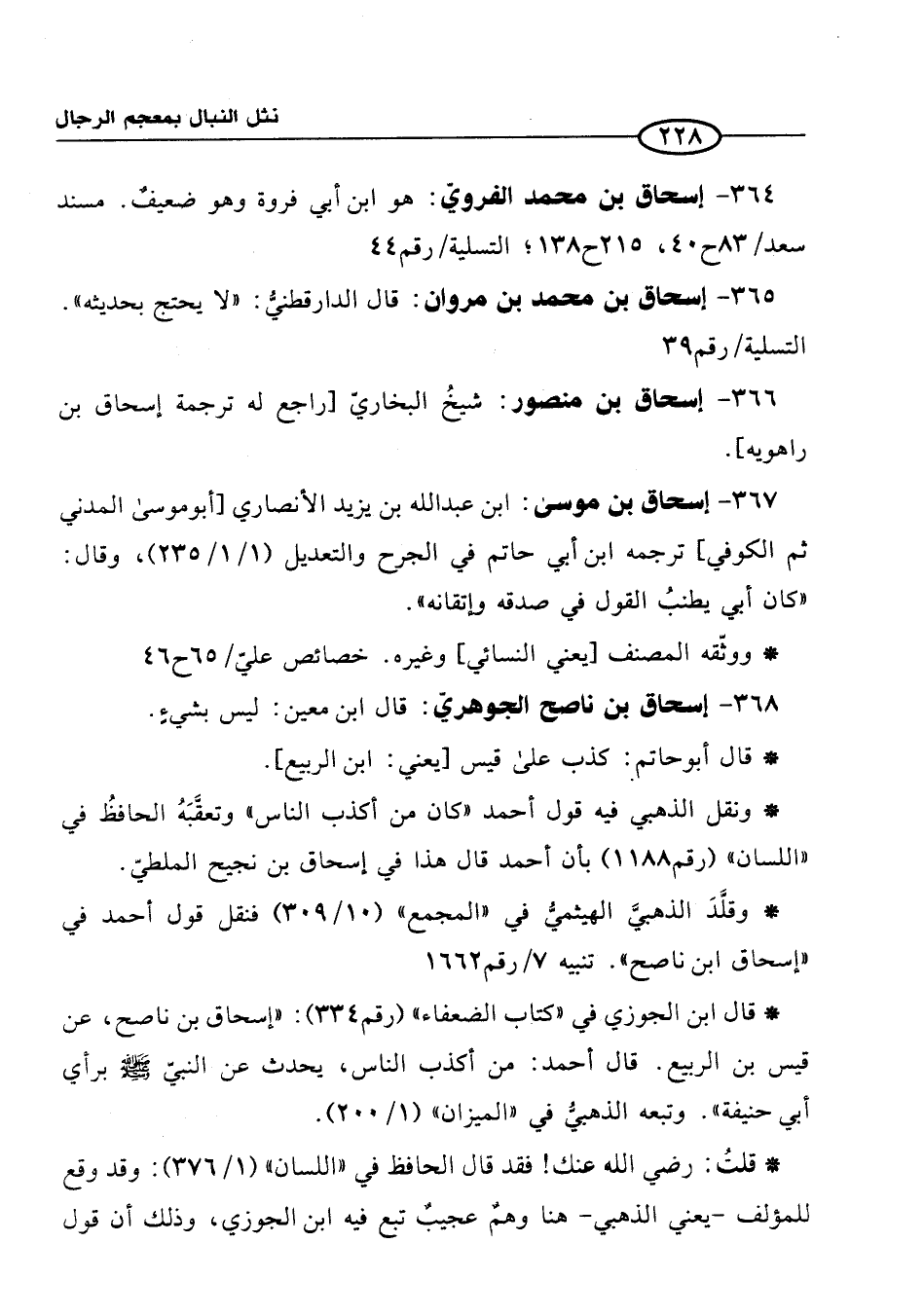 365 - إسحاق بن محمد بن مروان: قال الدارقطنيُّ: "لا يحتج بحديثه". التسلية/ رقم 39