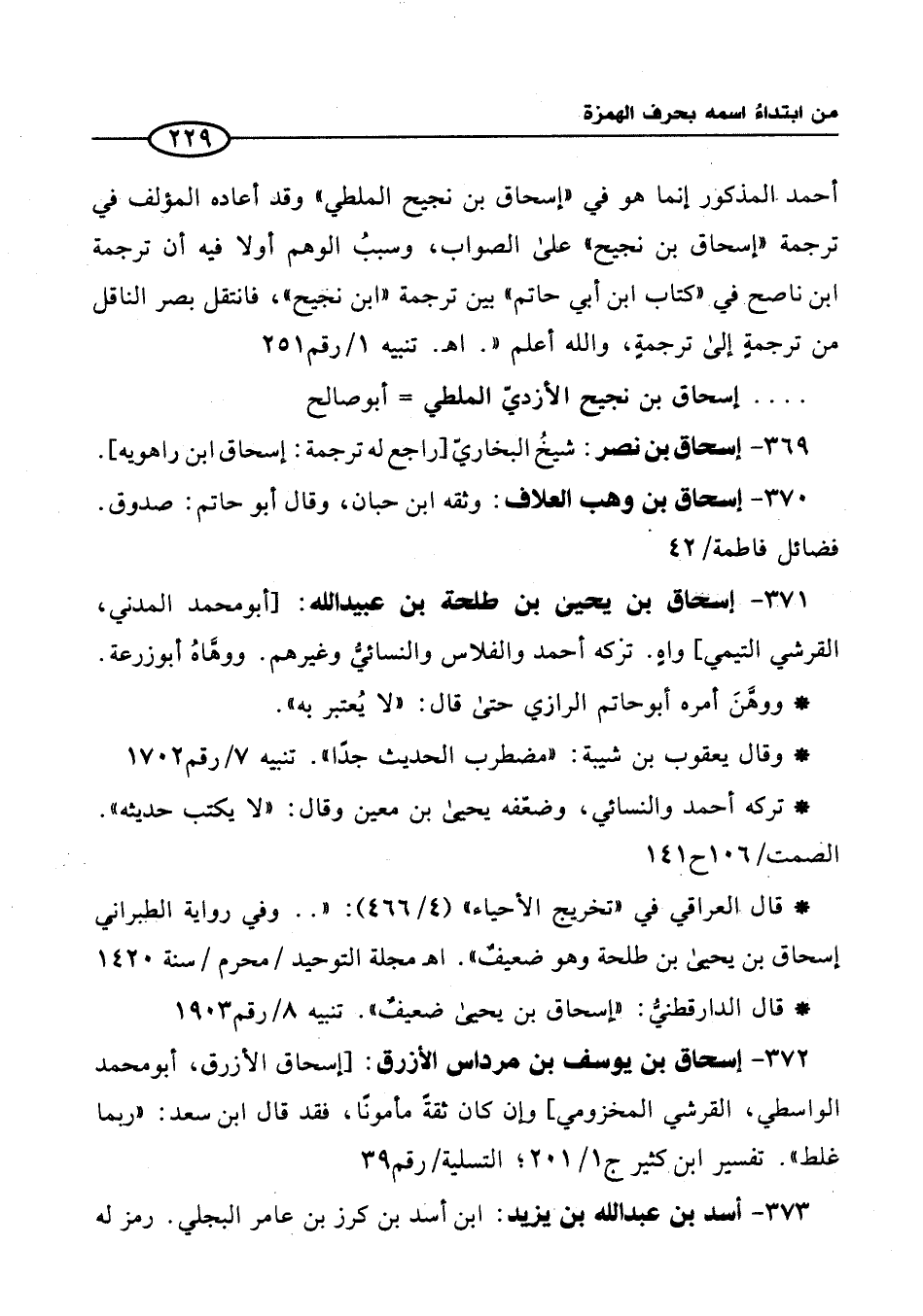 371 - إسحاق بن يحيى بن طلحة بن عبيد الله: [أبو محمد المدني، القرشي التيمي] واهٍ. تركه أحمد والفلاس والنسائيُّ وغيرهم. ووهَّاهُ أبو زرعة.