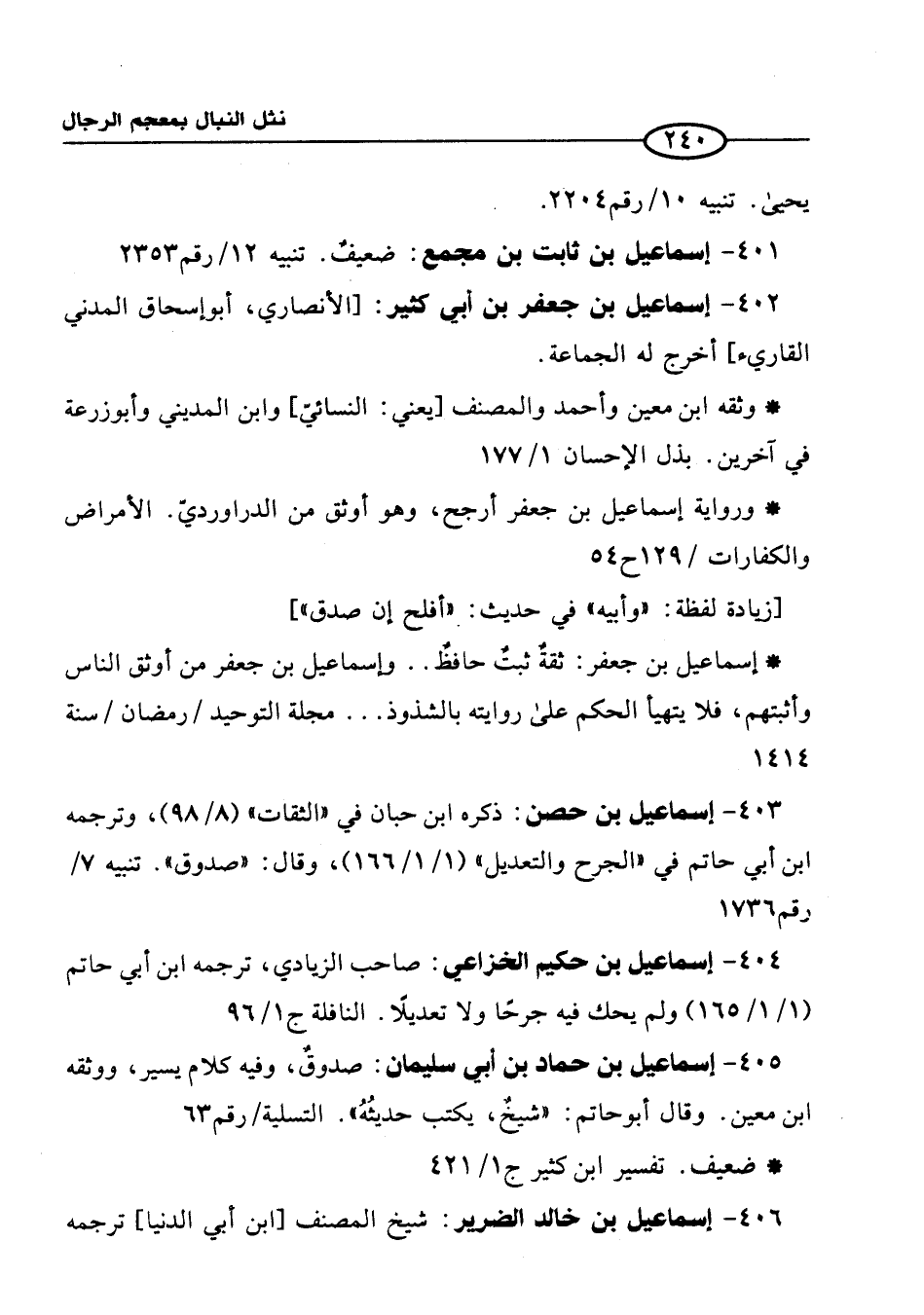 404 - إسماعيل بن حكيم الخزاعي: صاحب الزيادي، ترجمه ابن أبي حاتم (1/ 1/ 165) ولم يحك فيه جرحًا ولا تعديلًا. النافلة ج 1/ 96