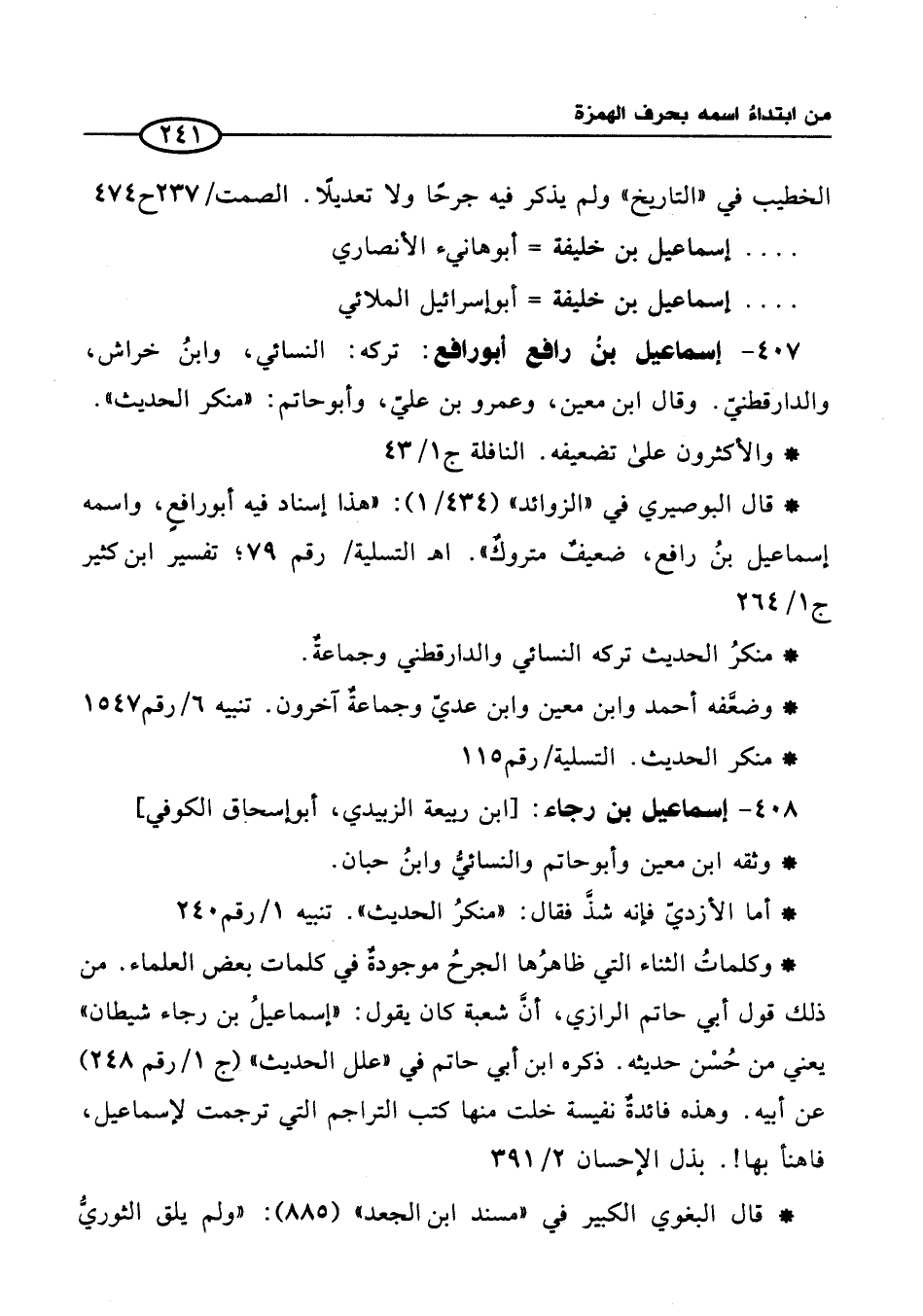407 - إسماعيل بنُ رافع أبو رافع: تركه: النسائي، وابنُ خراش، والدارقطنيّ. وقال ابن معين، وعمرو بن عليّ، وأبو حاتم: "منكر الحديث".