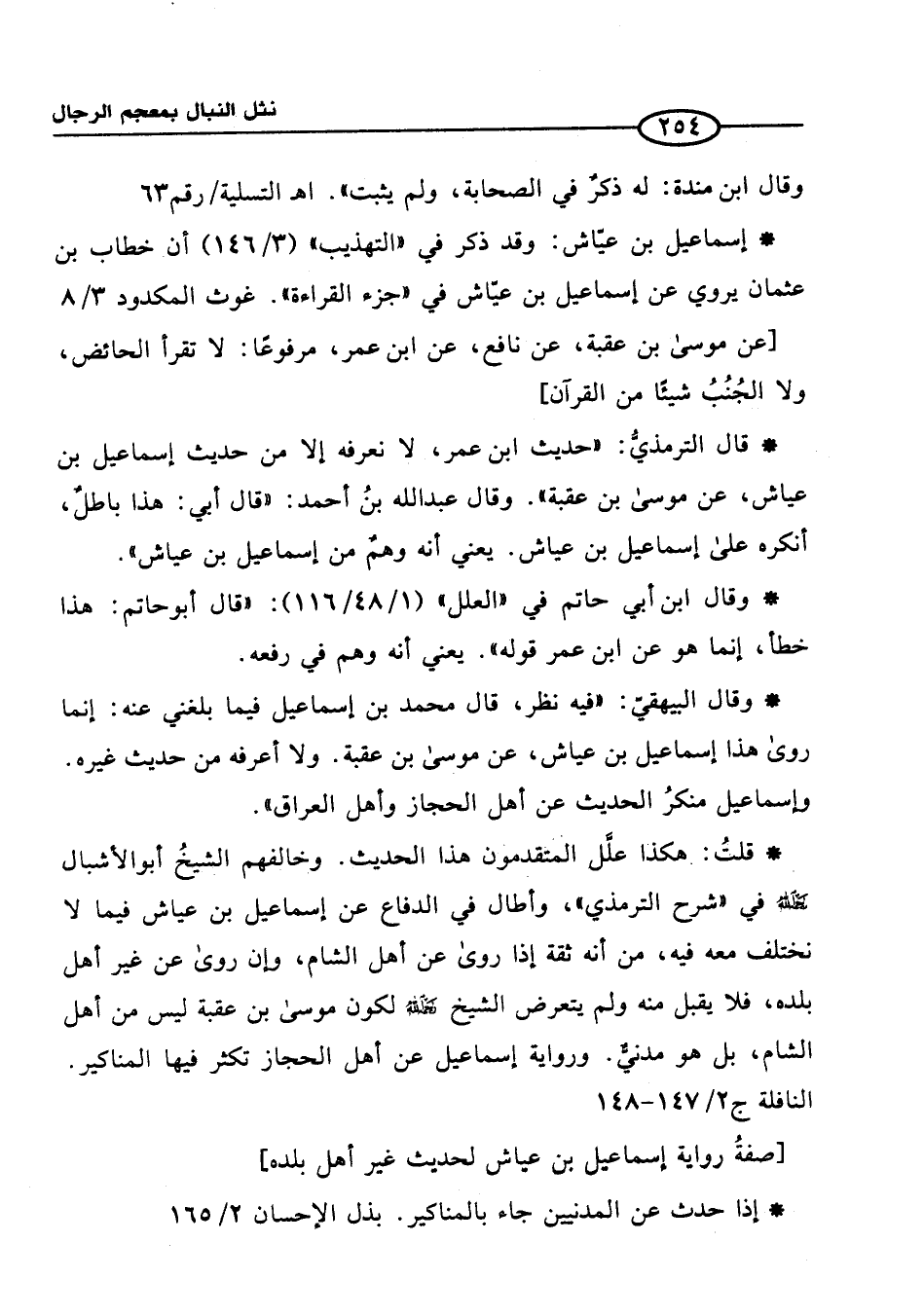 * قلتُ: هكذا علَّل المتقدمون هذا الحديث. وخالفهم الشيخُ أبو الأشبال رحمه الله في "شرح الترمذي"، وأطال في الدفاع عن إسماعيل بن عياش فيما لا نختلف معه فيه، من أنه ثقة إذا روى عن أهل الشام، وإن روى عن غير أهل بلده، فلا يقبل منه ولم يتعرض الشيخ رحمه الله لكون موسى بن عقبة ليس من أهل الشام، بل هو مدنيٌّ. ورواية إسماعيل عن أهل الحجاز تكثر فيها المناكير. النافلة ج 2/ 147 - 148