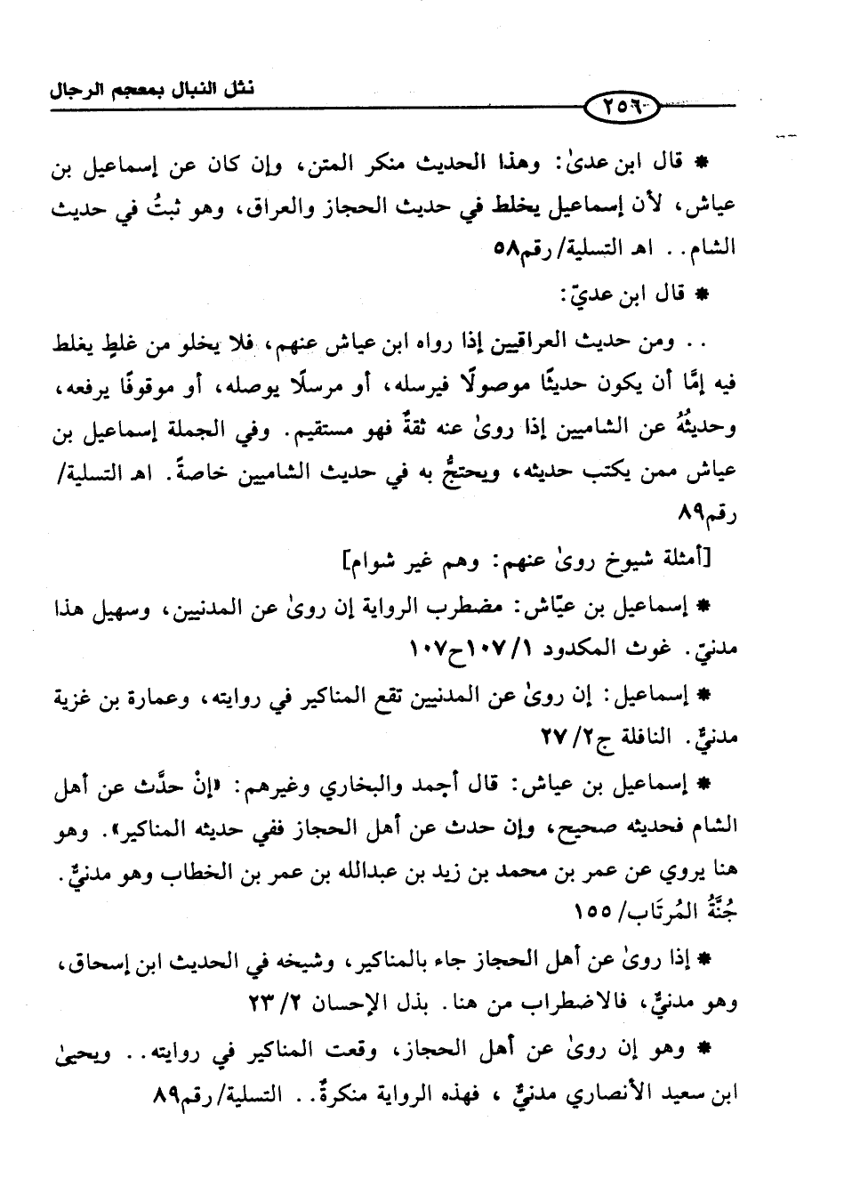 . . ومن حديث العراقيين إذا رواه ابن عياش عنهم، فلا يخلومن غلطٍ يغلطافيه إمَّا أن يكون حديثًا موصولًا فيرسله، أو مرسلًا يوصله، أو موقوفًا يرفعه، وحديثُهُ عن الشاميين إذا روى عنه ثقةٌ فهو مستقيم. وفي الجملة إسماعيل بن عياش ممن يكتب حديثه، ويحتجُّ به في حديث الشاميين خاصةً. اهـ التسلية/ رقم 89