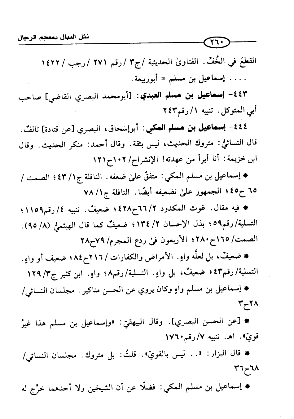 444 - إسماعيل بن مسلم المكي: أبو إسحاق، البصري [عن قتادة] تالفٌ. قال النسائيُّ: متروك الحديث، ليس بثقة. وقال أحمد: منكر الحديث. وقال ابن خزيمة: أنا أبرأ من عهدته! الانشراح / 102 ح 121