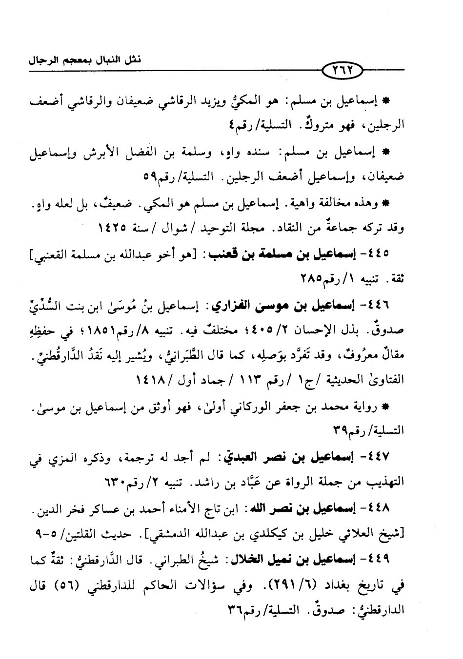 449 - إسماعيل بن نميل الخلال: شيخُ الطبراني. قال الدَّارقطنيُّ: ثقةٌ كما في تاريخ بغداد (6/ 291). وفي سؤالات الحاكم للدارقطني (56) قال الدارقطنيُّ: صدوقٌ. التسلية/ رقم 36