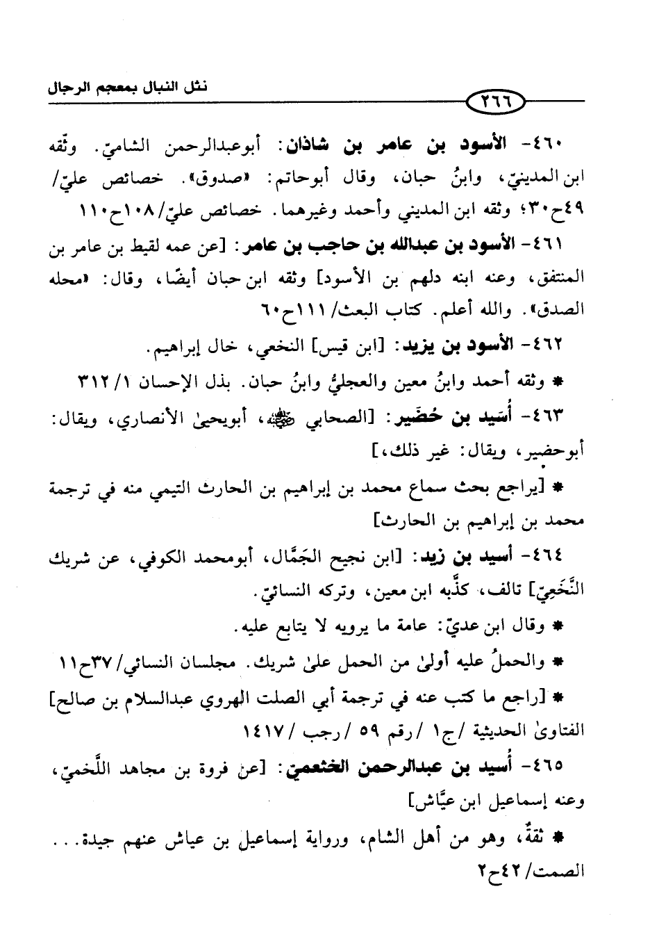460 - الأسود بن عامر بن شاذان: أبو عبد الرحمن الشاميّ. وثّقه ابن المدينيّ، وابنُ حبان، وقال أبو حاتم: "صدوق". خصائص عليّ/ 49 ح30؛ وثقه ابن المديني وأحمد وغيرهما. خصائص عليّ/108ح110
