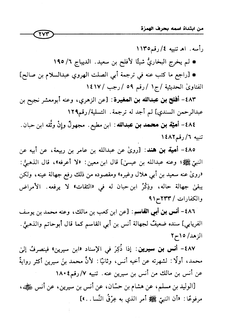 487 - أنس بن سيرين: إذا ذُكِرَ في الإسناد "ابن سيرين" فينصرفُ إلى محمد، أولًا: لشهرته عن أخيه أنس، وثانيًا: لأنَّ محمد بنَ سيرين أكثر روايةً عن أنس بن مالك من أنس بن سيرين عنه. تنبيه 7/ رقم 1804