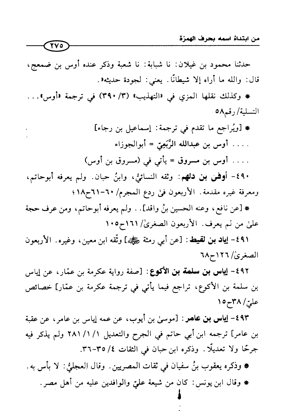 491 - إياد بن لقيط: [عن أبي رمثة -رَضِيَ الله عَنْهُ-]، وثّقه ابن معين، وغيره. الأربعون الصغرى / 126 ح 68