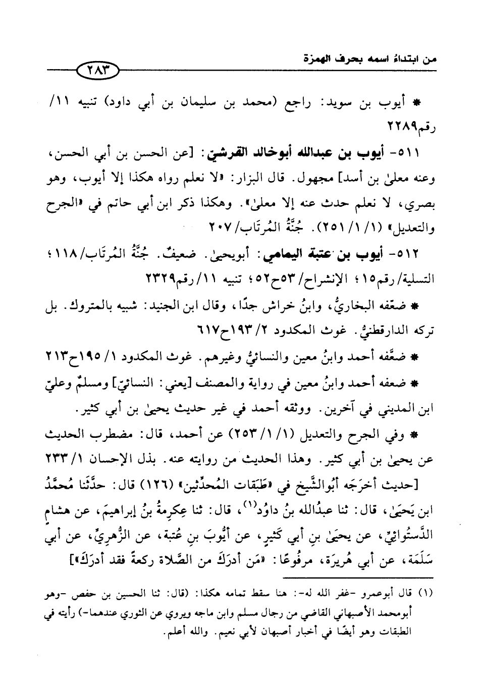511 - أيوب بن عبد الله أبو خالد القرشيّ: [عن الحسن بن أبي الحسن، وعنه معلى بن أسد] مجهول. قال البزار: "لا نعلم رواه هكذا إلا أيوب، وهو بصري، لا نعلم حدث عنه إلا معلى". وهكذا ذكر ابن أبي حاتم في "الجرح والتعديل" (1/ 1/ 251). جُنَّةُ المُرتَاب/ 207